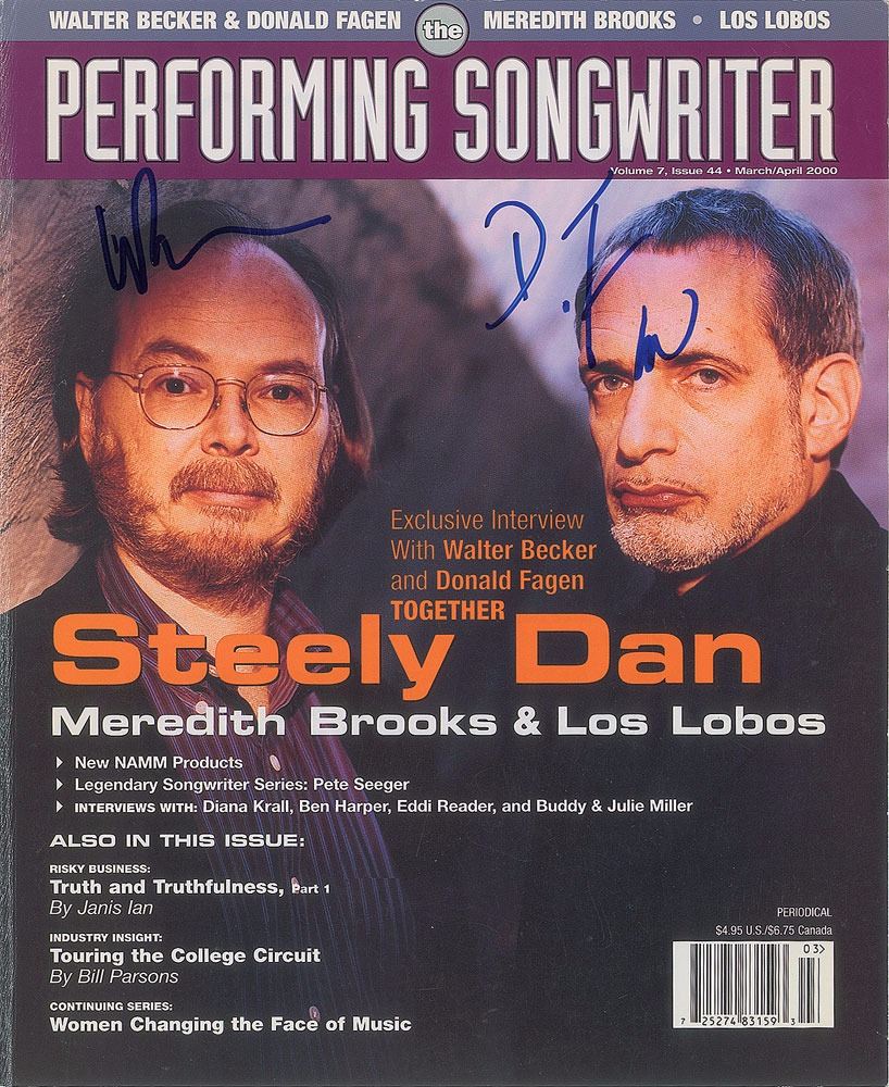 Magazine cover from a 2000 issue of The Performing Songwriter, 9 x 11, signed in blue felt tip by Steely Dan founders Walter Becker and Donald Fagen. In fine condition. Originally obtained by in-person specialist Mike Wehrmann.