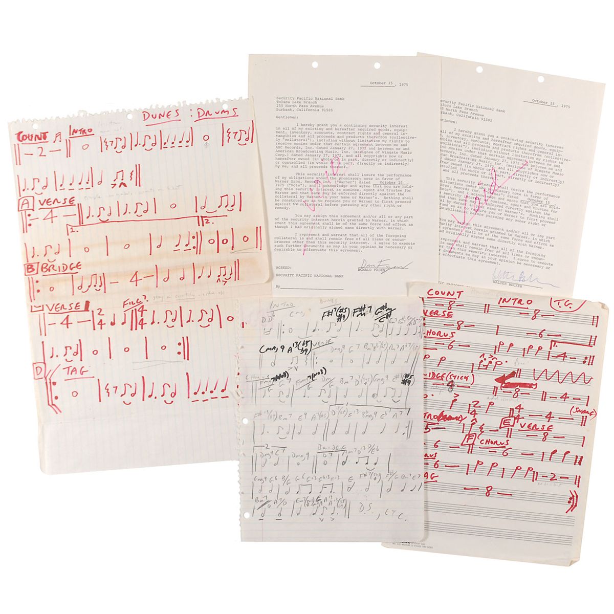 Collection of Steely Dan material comprised of three drum charts written out by lead singer Donald Fagen, and three documents. The charts include: two pages of drum charts for ‘Dunes,’ written for the recording session featuring drummer Christopher Parker; a one-page ‘Dunes’ chord chart; a one-page chord chart for ‘Tomorrow’s Girls,’ written by Fagen before he tracked his Rhodes piano part. Also includes two voided financial documents, one signed by Fagen and one signed by Steely Dan co-founder Walter Becker, each one page, October 15 ,1975; and a lengthy Warner Bros. recording contract signed by Fagen, 60 pages, March 1, 1984. In overall fine condition, with expected wear from use in a studio setting. Accompanied by a letter of authenticity from the audio engineer and two images from recording sessions.