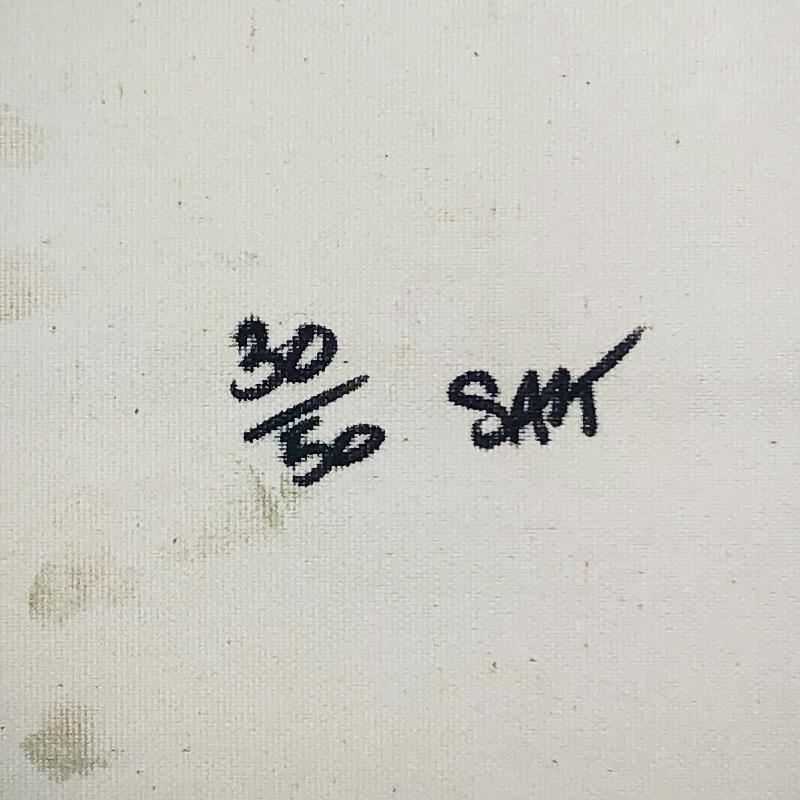 "Steepechase, Coney Island" is limited edition hand pulled silkscreen unique mixed media on canvas by Andy Warhol protege Steve Kaufman (1960-2010). This piece is numbered and hand signed inverso and includes a letter of authenticity. As is common with Kaufman's works, this piece may have perceived minor flaws, but is in overall good condition. Measures approximately 16.5" x 17" before cropping.