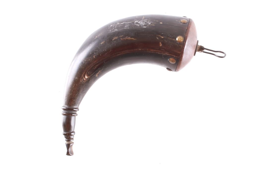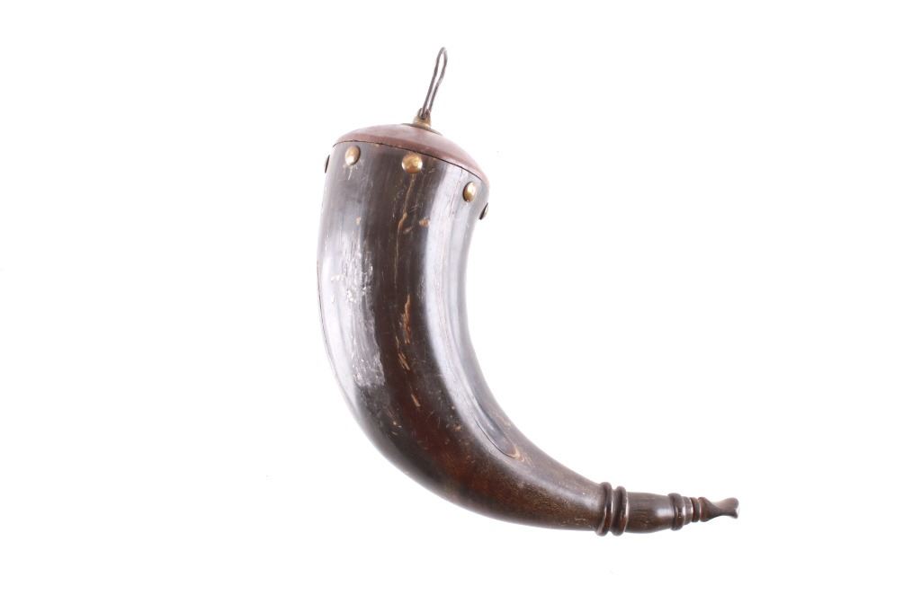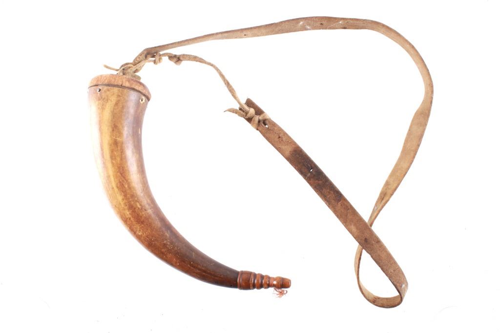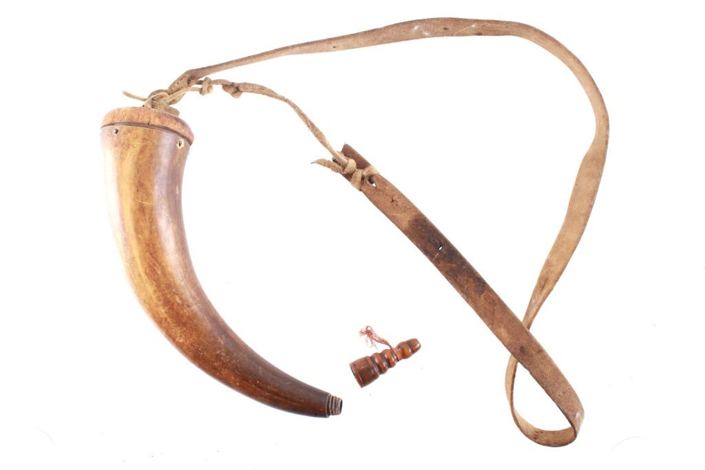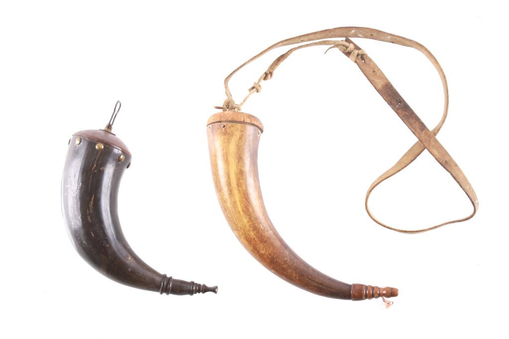 Featured in this lot is this Civil War era steer horn powder flask collection circa 1860's. There are two flask's in this collection. The first shows a darker steer horn construction that shows a turned wooden base stopper that is tacked in with brass tacks and shows a flute stopper from a small turned wooded cork and is marked on the top 'U.M.C. Co. No. 16'. The second is a lighter steer horn construction that features a turned wooden top that is tacked into the steer horn and shows a turned wooden cork and a leather shoulder sash. The condition of this pair of powder horns is good with no obvious signs of damage and shows good overall condition. The measurements of these powder horns is 7 1/2" x 7 1/2" x 3" for the darker powder horn and 9" x 8" x 2 1/2" for the lighter powder horn.