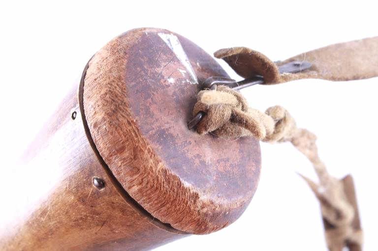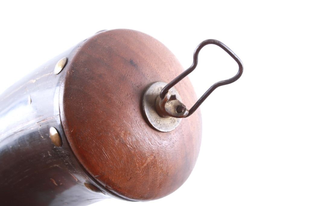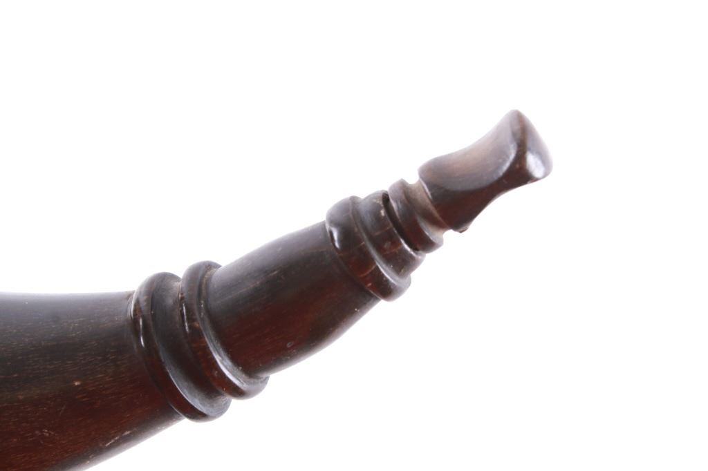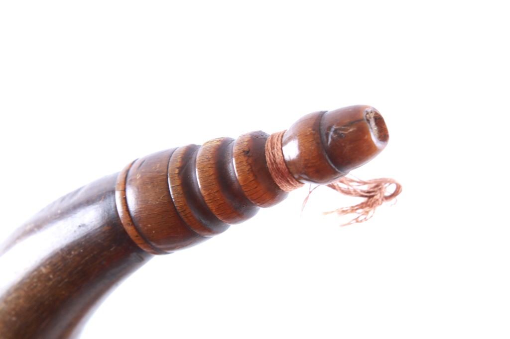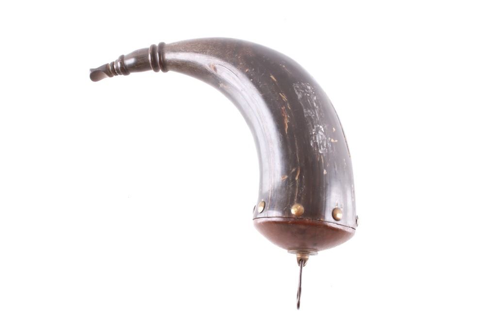 Featured in this lot is this Civil War era steer horn powder flask collection circa 1860's. There are two flask's in this collection. The first shows a darker steer horn construction that shows a turned wooden base stopper that is tacked in with brass tacks and shows a flute stopper from a small turned wooded cork and is marked on the top 'U.M.C. Co. No. 16'. The second is a lighter steer horn construction that features a turned wooden top that is tacked into the steer horn and shows a turned wooden cork and a leather shoulder sash. The condition of this pair of powder horns is good with no obvious signs of damage and shows good overall condition. The measurements of these powder horns is 7 1/2" x 7 1/2" x 3" for the darker powder horn and 9" x 8" x 2 1/2" for the lighter powder horn.