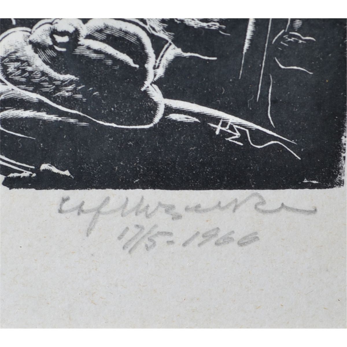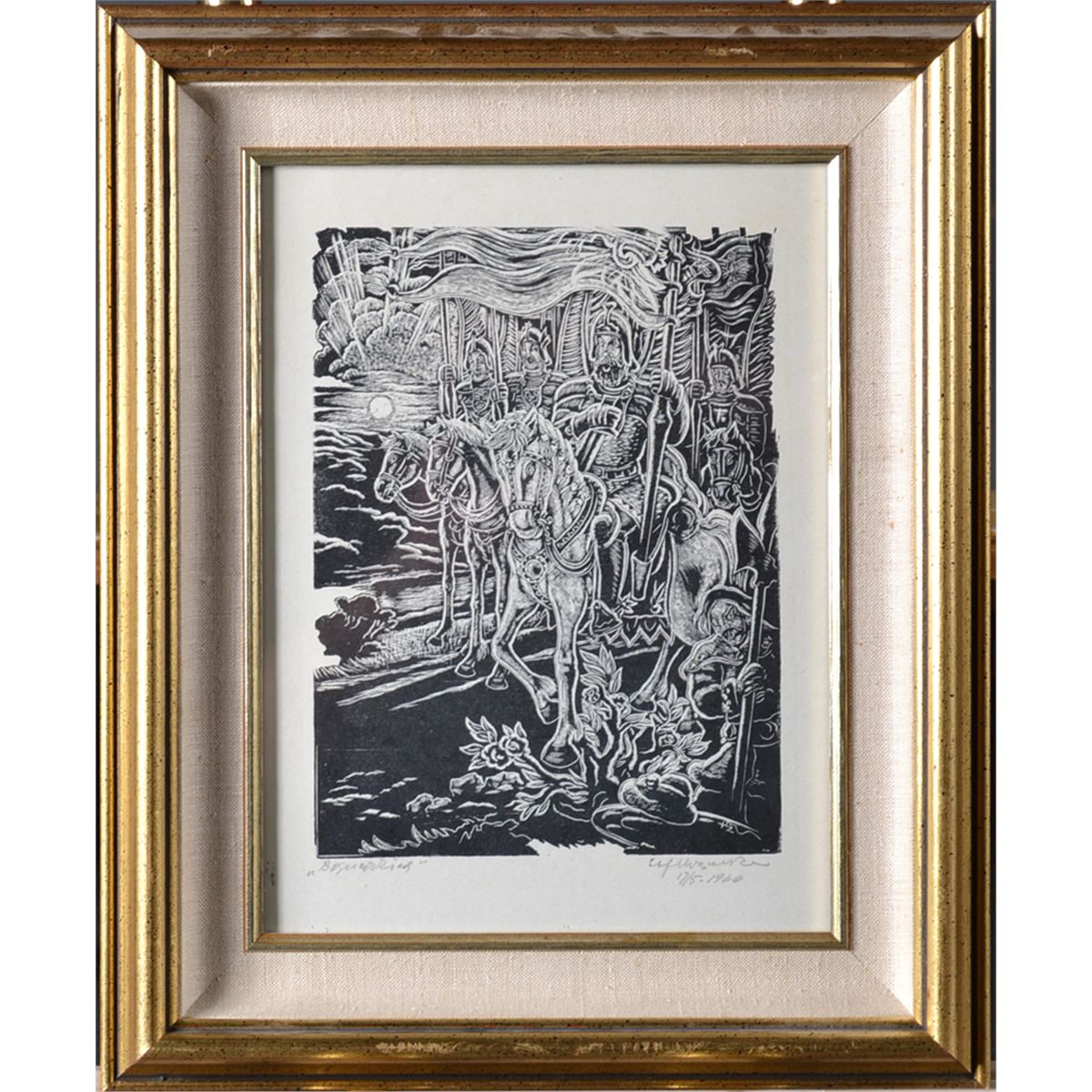 Depicting soldiers on horses within a landscape. Titled in in Polish pencil in LL, signed, edition and dated 1966 in LR. Stefan Mrowzewski (1894-1975), Poland was a known printmaker and illustrator. In a gold tone speckled frame with linen mat. 9.5" H x 6.75" W, sight, 16.25" H x 13.25" W, framed. Private collection of the late Benedict Markowski, a long time archivist of the Detroit Public Library.