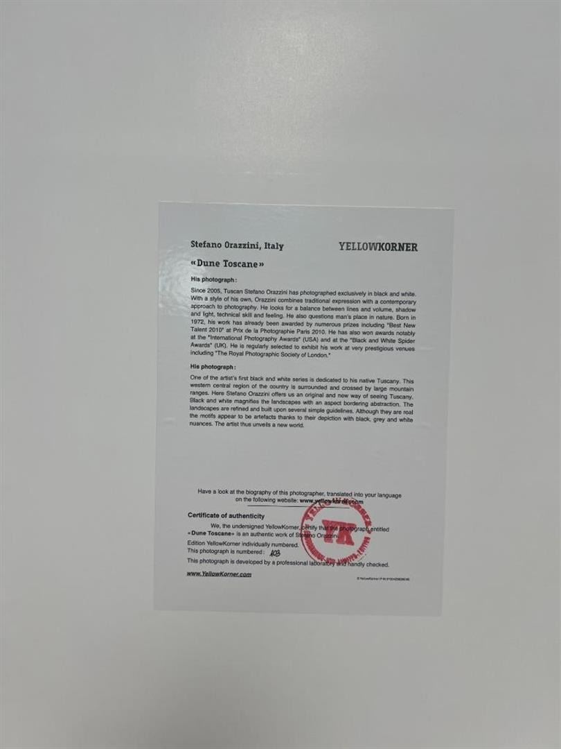 Stefano Orazzini Italy Dune Toscane YellowKorner Certified Photograph. Certificate of Authenticity from YellowKorner affixed to the back. Matted Dimensions 16"x20". Protected with Clear Mylar Sleeve.
