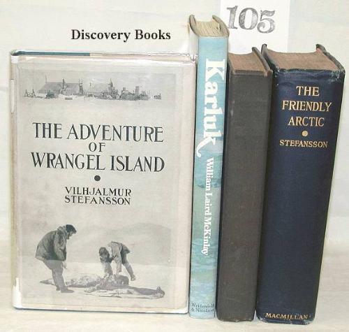 (Stefansson, Vilhjalmur) (1) THE FRIENDLY ARCTIC. THE STORY OF FIVE YEARS IN POLAR REGIONS. New York: Macmillan 1921 xxxi,784pp. Many photo plates, maps incl 2 folding in pocket. Original cloth, includes original photo of Stef tipped onto front endpaper. (2) THE ADVENTURE OF WRANGEL ISLAND. New York: Macmillan 1925 xxviii,424pp. Photo illus, folding map. Very good in scarce dust wrapper. Bartlett, Robert A. & Ralph T. Hale. (3) THE LAST VOYAGE OF THE KARLUK. FLAGSHIP OF VILHJALMUR STAFANSSON'S CANADIAN ARCTIC EXPEDITION OF 1913-16. Boston: Small, Maynard (1916) 329pp. Photo illus. Original cloth, spine very dull, sm. strip missing from margin of fly title. Generally good & tight. ……with …….(4). Mckinlay, William Laird. KARLUK THE GREAT UNTOLD STORY OF ARCTIC EXPLORATION. London, (c,1976) 170pp. Illus. Cloth, very good in d/j. (4)