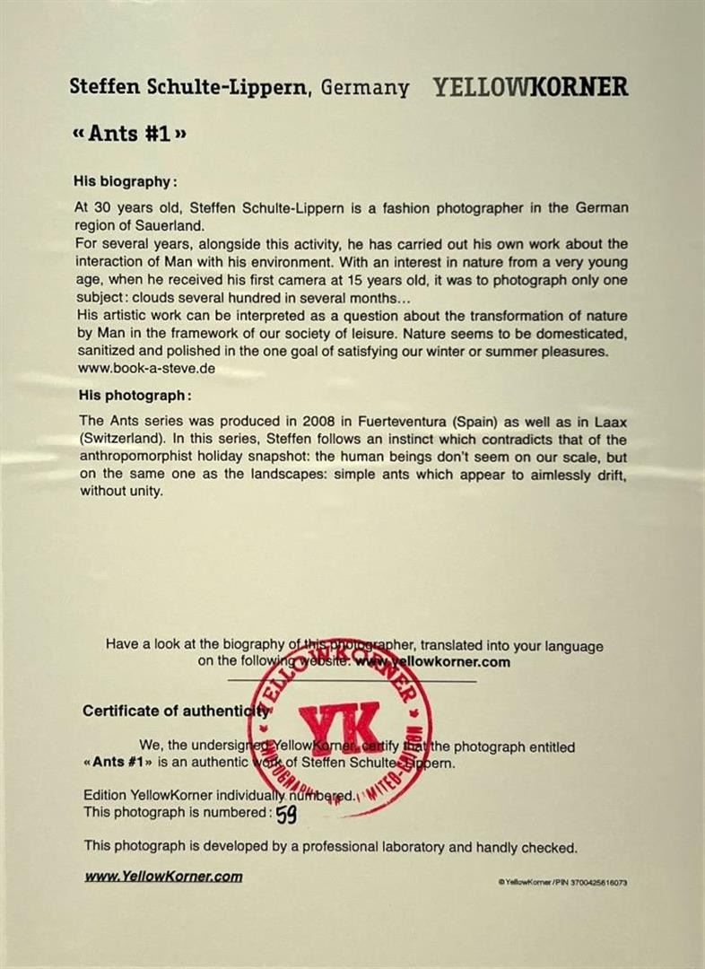 Steffen Schulte Lippern Germany Ants #1 YellowKorner Certified Photograph. Certificate of Authenticity from YellowKorner affixed to the back. Matted Dimensions 16"x20". Protected with Clear Mylar Sleeve.