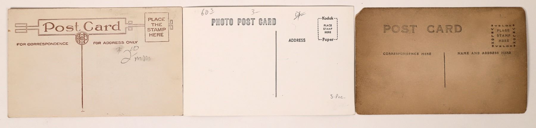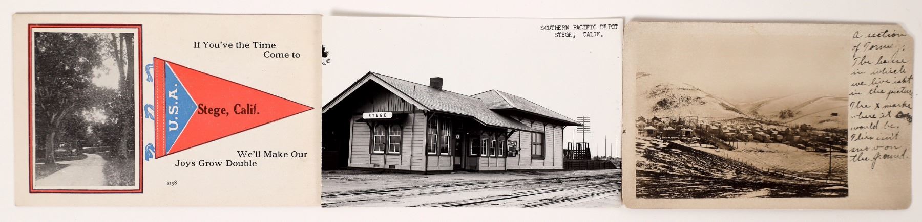 3 Stege postcards. Red pennant, Southern Pacific depot, town in snow with corner chip.All unmailed. California Stege