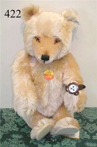 Steiff 1991 Watch Teddy with watch, Mohair, app. 15 3/4". White tag #00020 of 200. EAN# 8530/43.