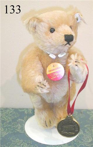 Steiff 1997 Celebration Bear with Steiff Event Bear 1998-1999 medallion, app. 8 1/2". Ear and chest tags, white tag # 00107 of 3000. EAN#665325.