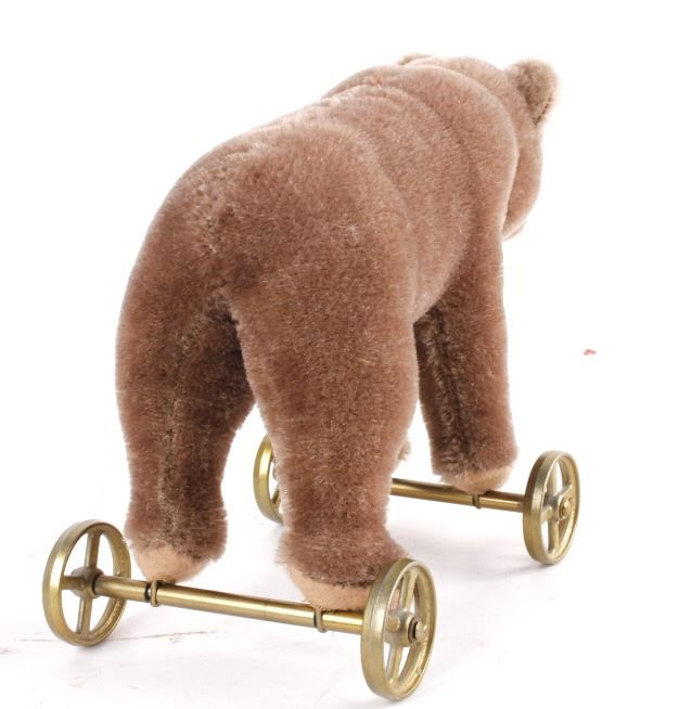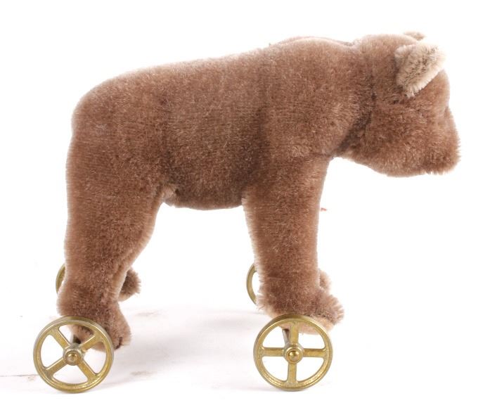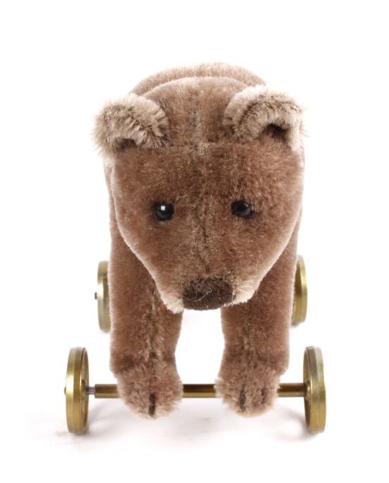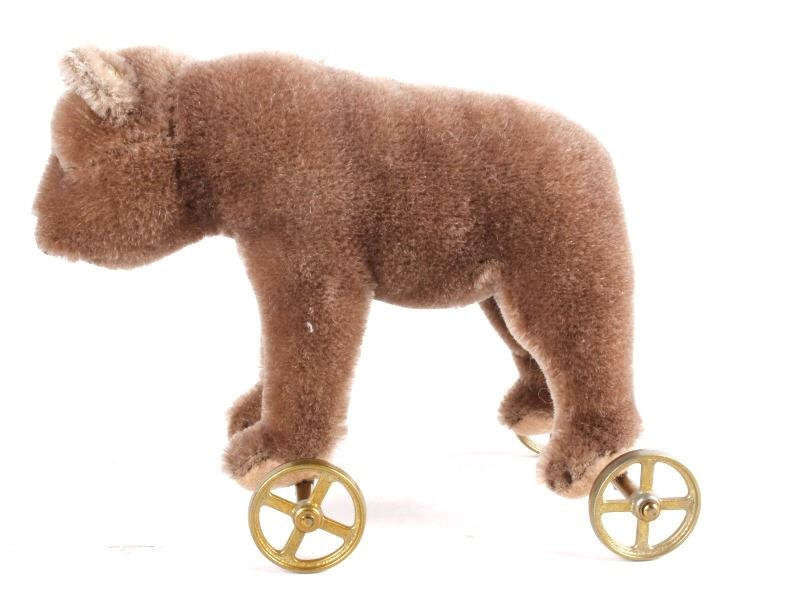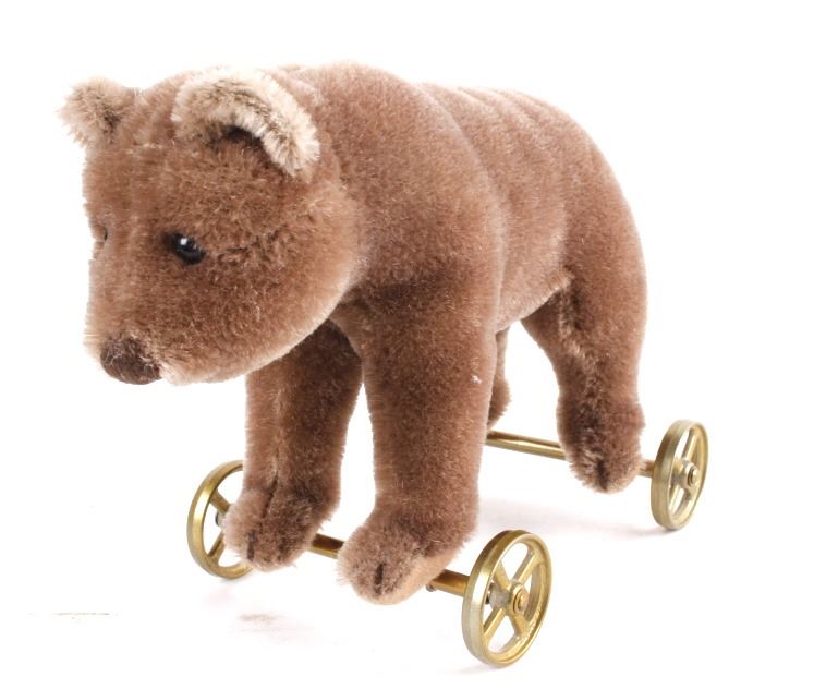 This lot features a Steiff Bear on wheels. Steiff is a German-based plush toy company. It was founded in 1880 by Margarete Steiff, who was later assisted by her brother Fritz. Steiff is best know for its invention of the teddy bear in 1902. This is among one of their pre-war toys. It is in good overall condition for its age. Measures: 6" W x 5" H x 3" D