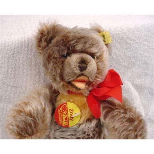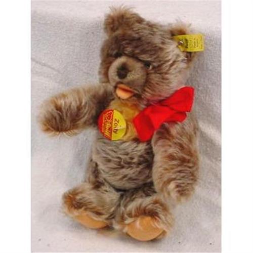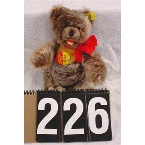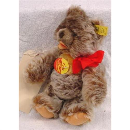 Steiff bear named "Zotty," shaggy fur with interesting light brown color and open mouth with movable limbs and red bow. Measures 9" x 5" and weighs 6 ounces. [117]