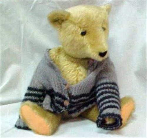 Button in Ear. Fully Jointed, Long Arm, Hump Back, Wearing Black & Gray Sweater. Missing Yellow Tag