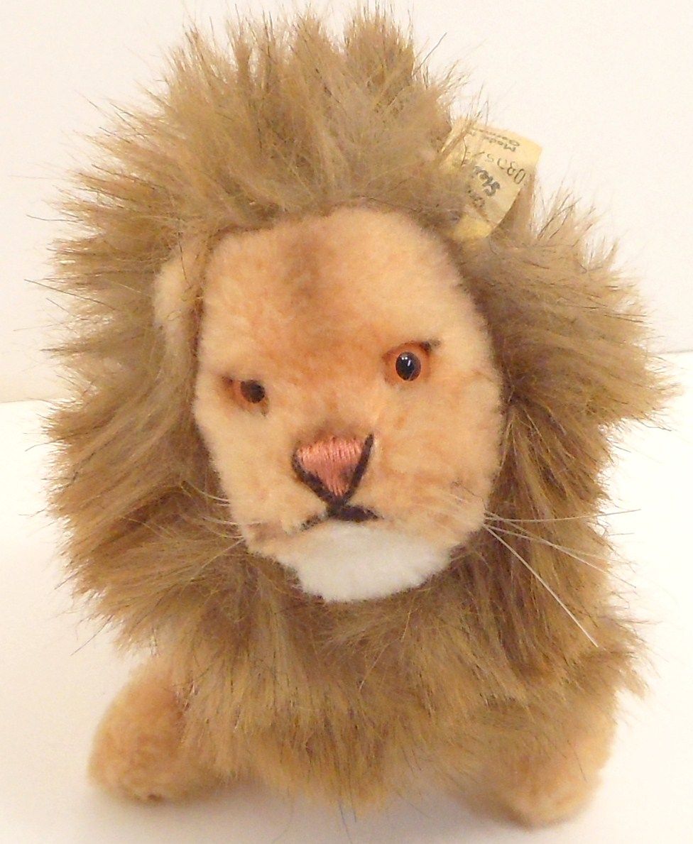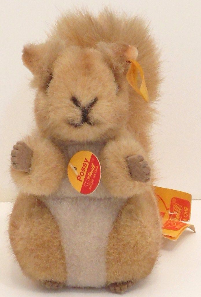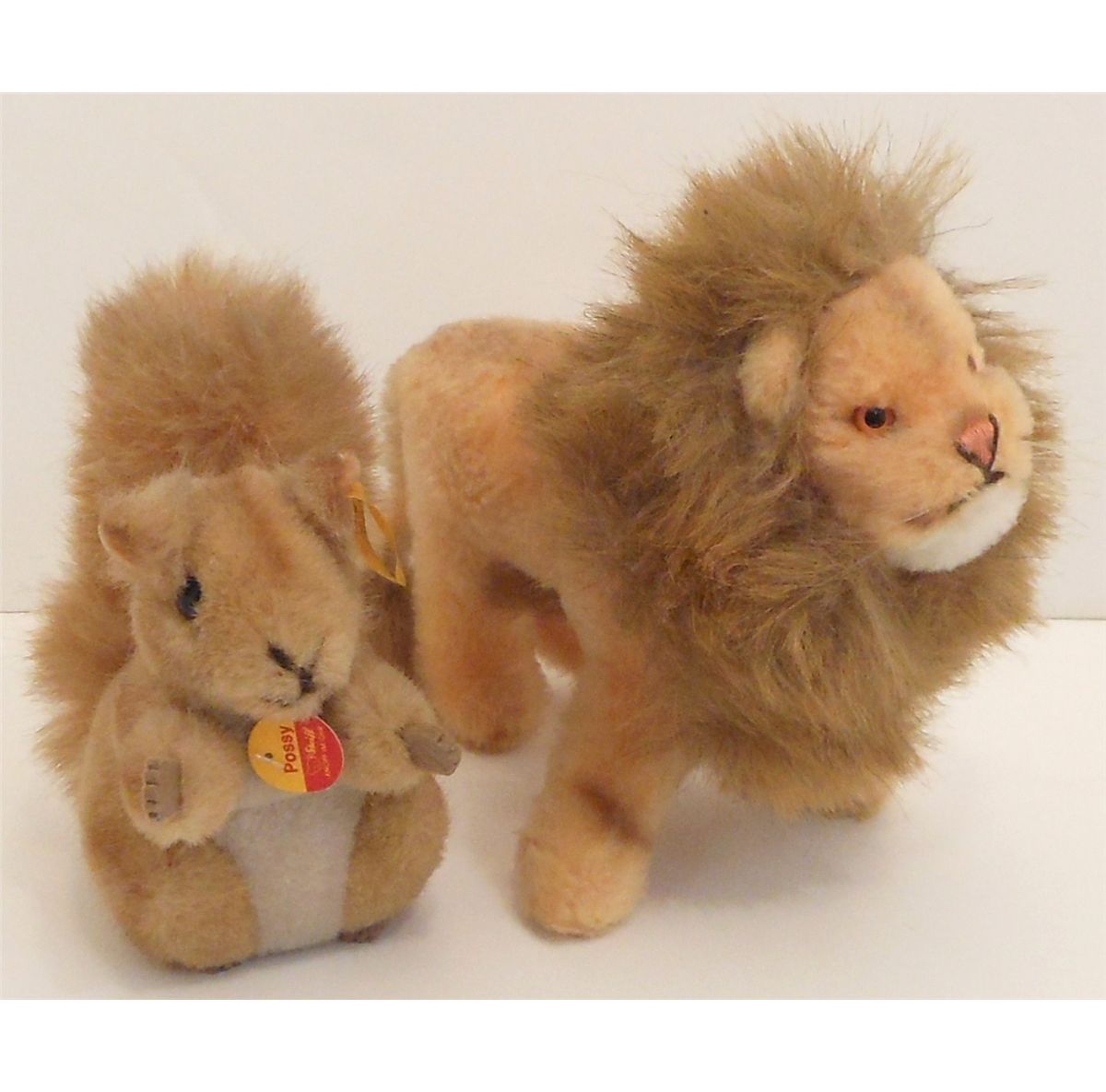 5 1/2" tall x 4 1/2" long x 3 1/2" wide, Possy the squirrel 1466/12 with button, flag, name tag and attached cleaning tag. Excellent condition. 7" tall x 8" long x 4" wide, Leo Lion 0805/18 with button and flag. Great condition.