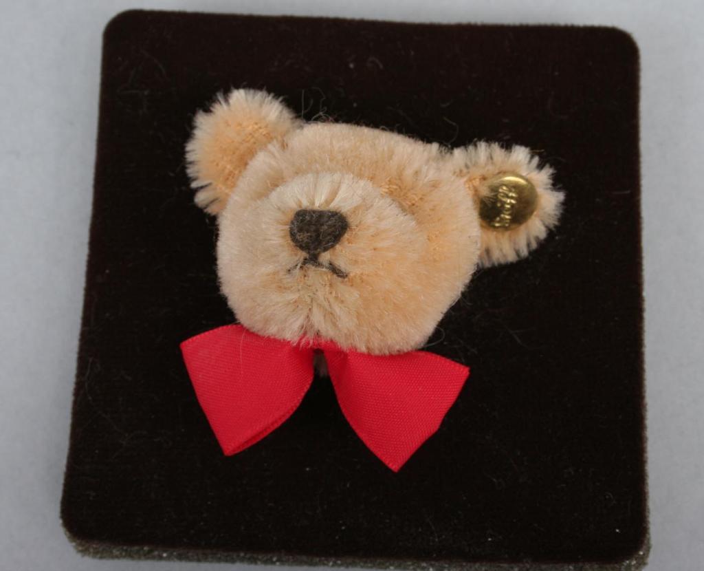 Constructed in light beige mohair, wearing a red ribbon, with brass Steiff button in ear; together in original brown plastic box. Condition: excellent, no damage or repair.