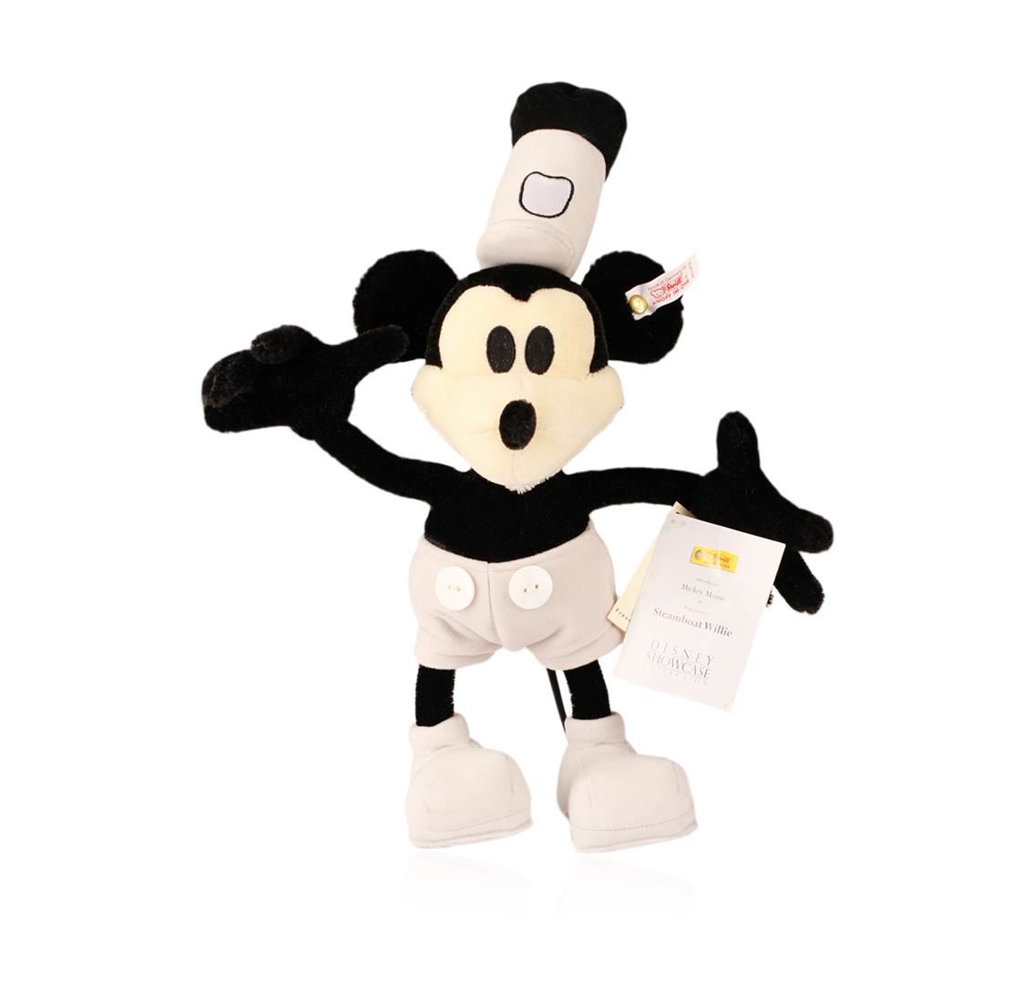 This is a Steiff "Steamboat Willie". The early role played by Mickey Mouse is reflected in this 22cm mohair piece in black/white. The shoes, trousers and hat are of trevira velvet. He was made in cooperation with the Walt Disney Company in 1999-2000 in a limited edition of 10,000 pieces. This is number 3460/10000. No box.