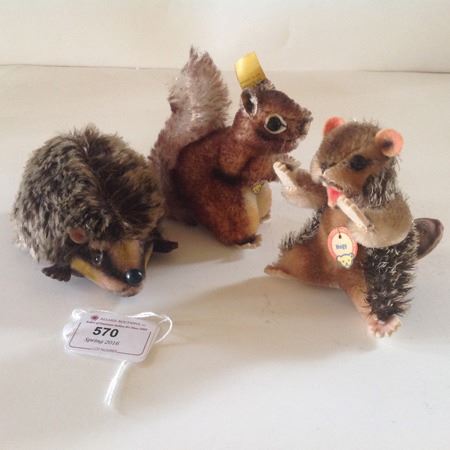 Ca. 1950s-1960s, Vintage collection of three originally tagged "Steiff Germany" stuffed animals, including a nagy biber (beaver), possy eichhörnchen (squirrel), and joggi igel (hedgehog). Good condition. 4" tall