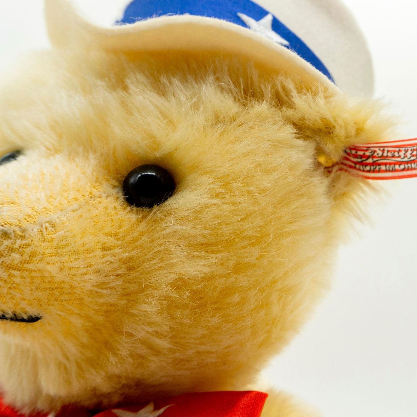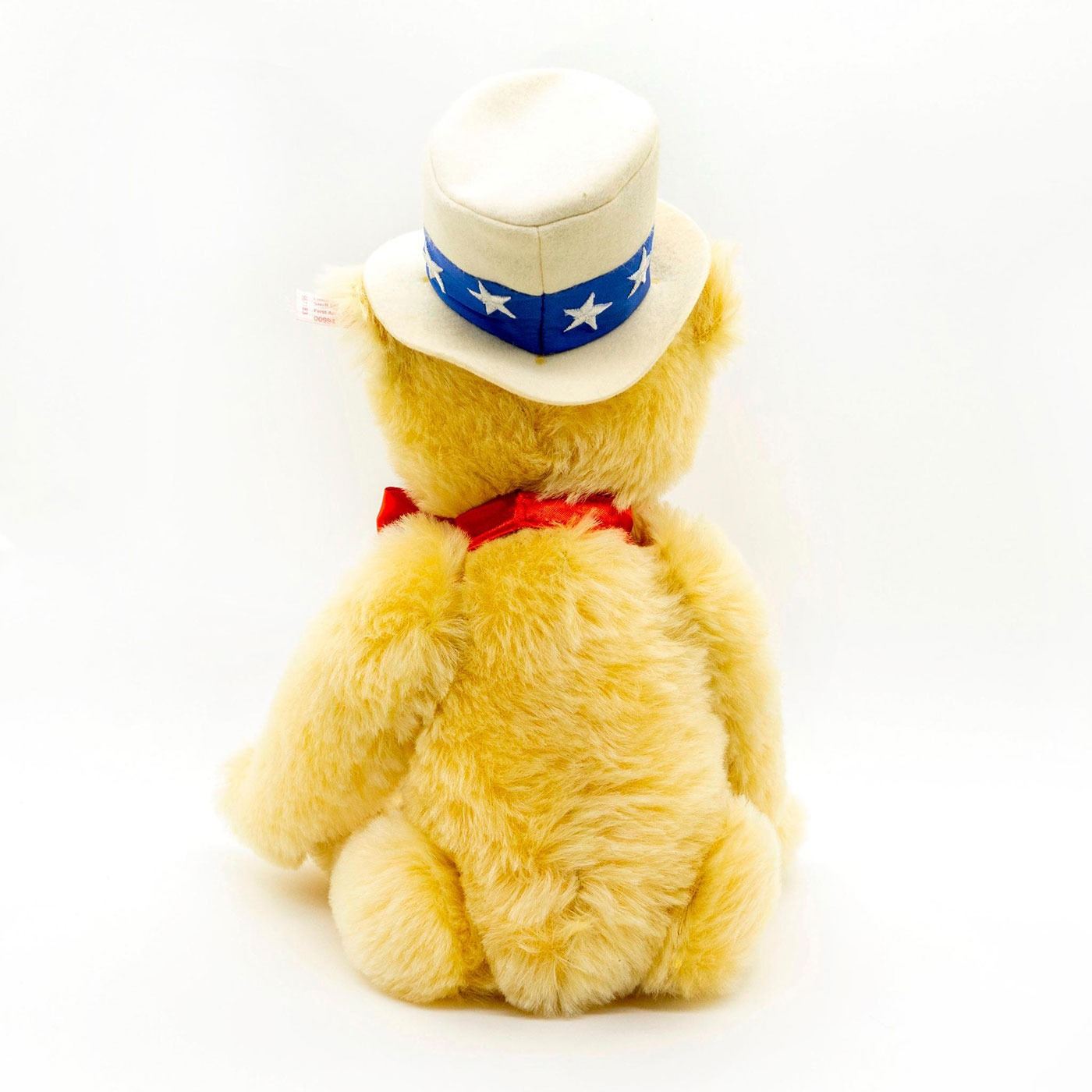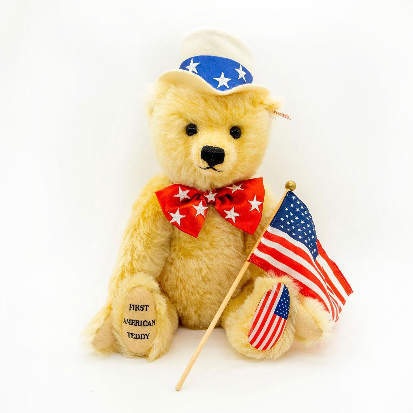 Fully jointed, mohair, glass eyes, shaved snout, wearing an American themed bowtie and hat. Original tag attached.