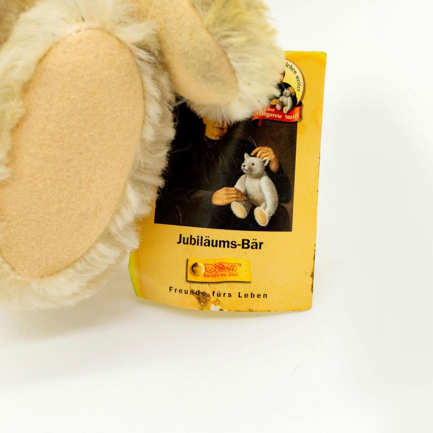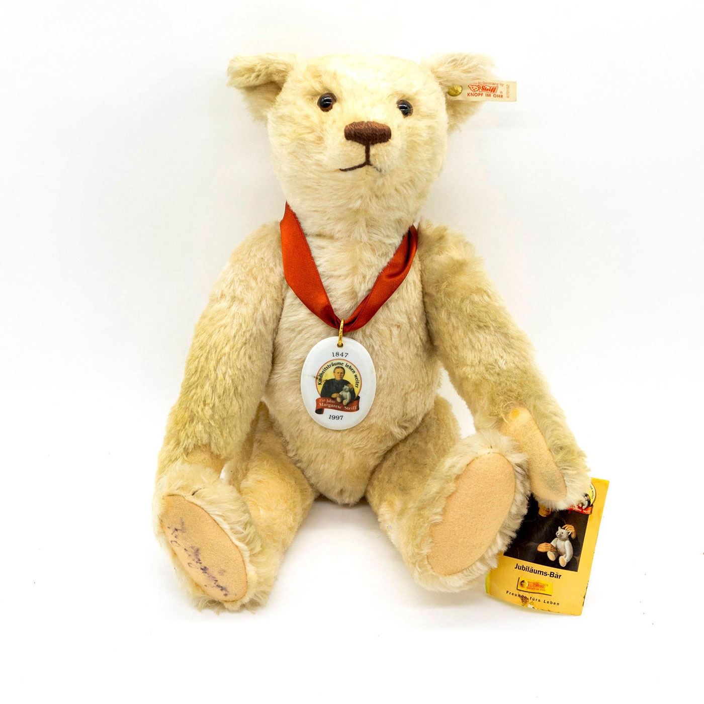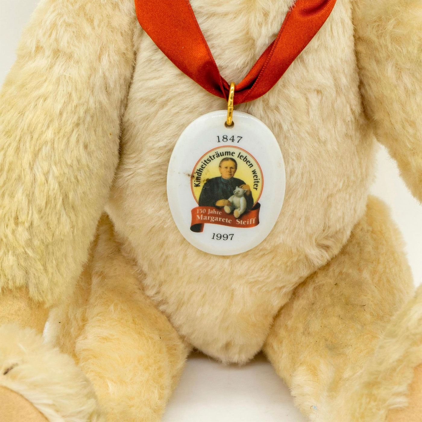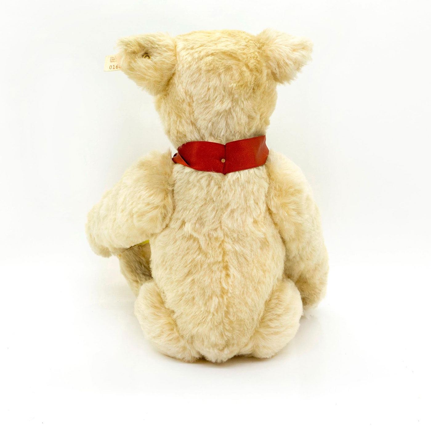 Fully jointed, mohair, glass eyes, shaved snout. Wearing a ribbon with a ceramic pendant with Margarete Steiff on it. Original tag attached.