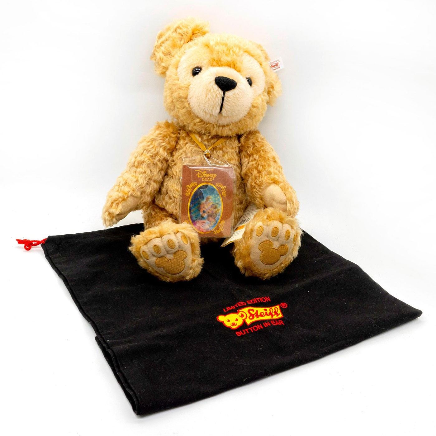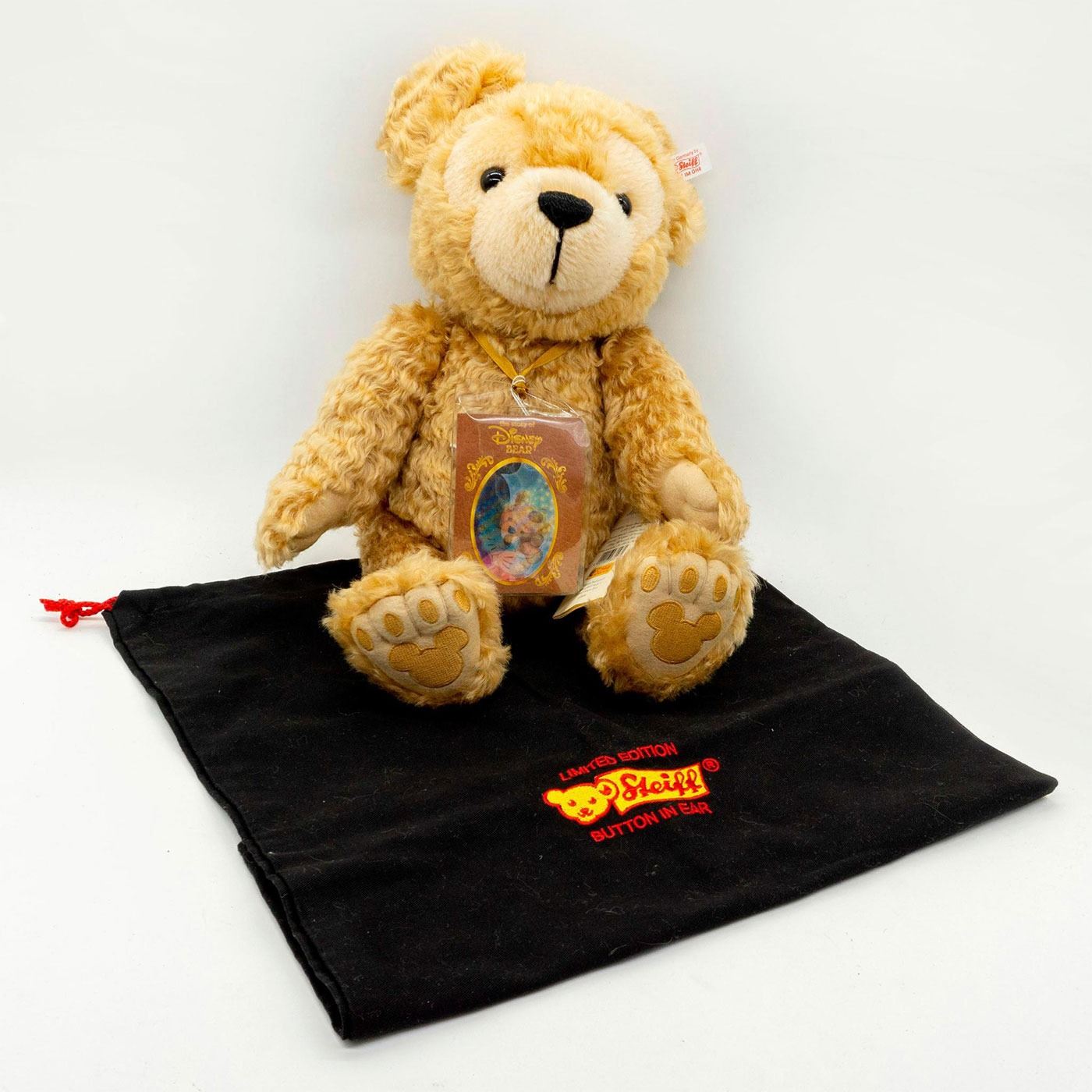 Fully jointed, mohair, glass eyes, shaved face. Face shaped like a Mickey silhouette. Mickey Mouse paws and ears. Original tag and holographic art on a tag attached. Embroidered Mickey logo on the bottom.