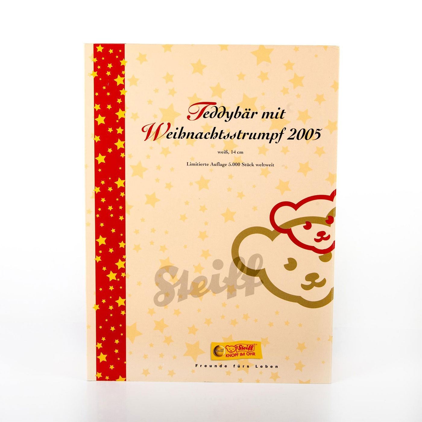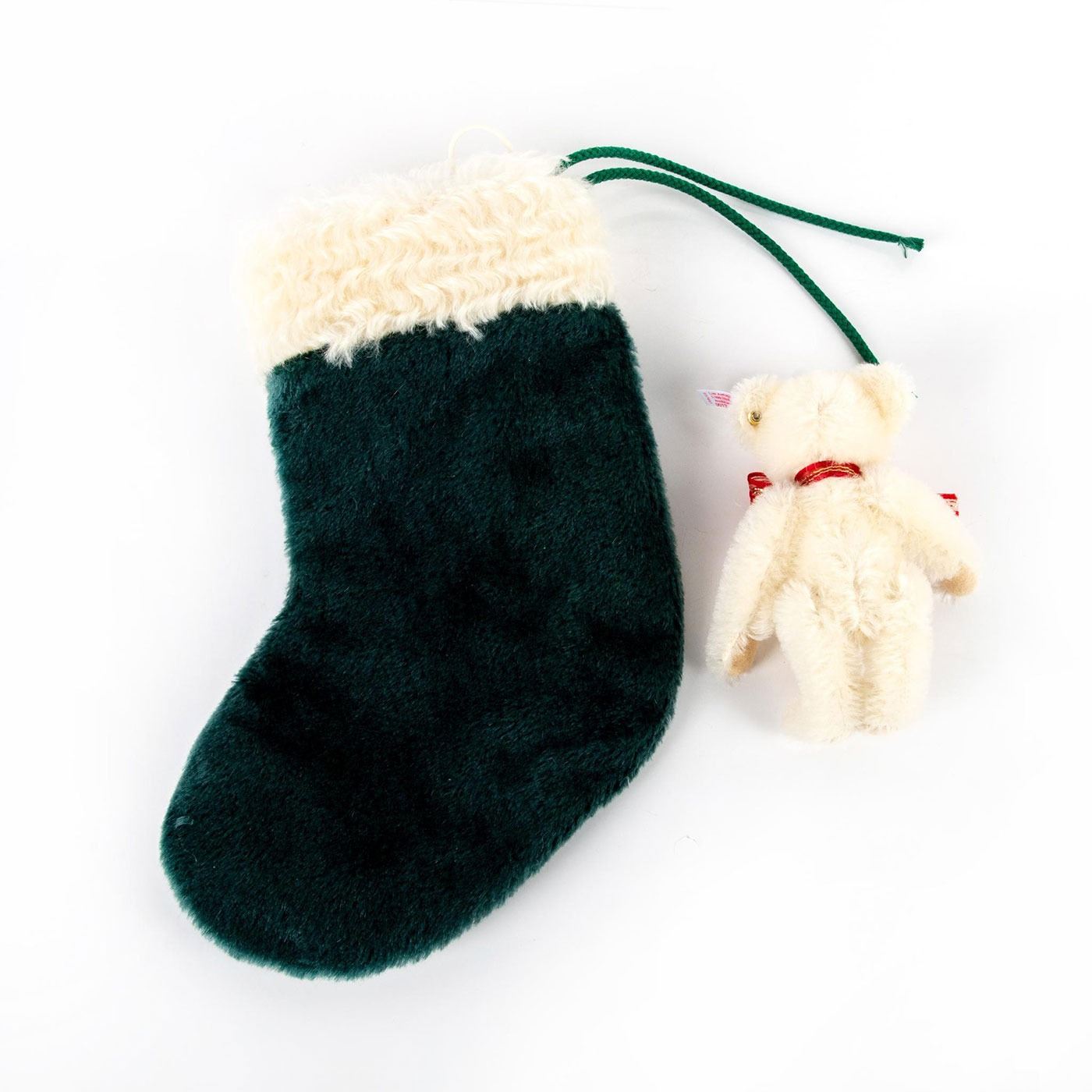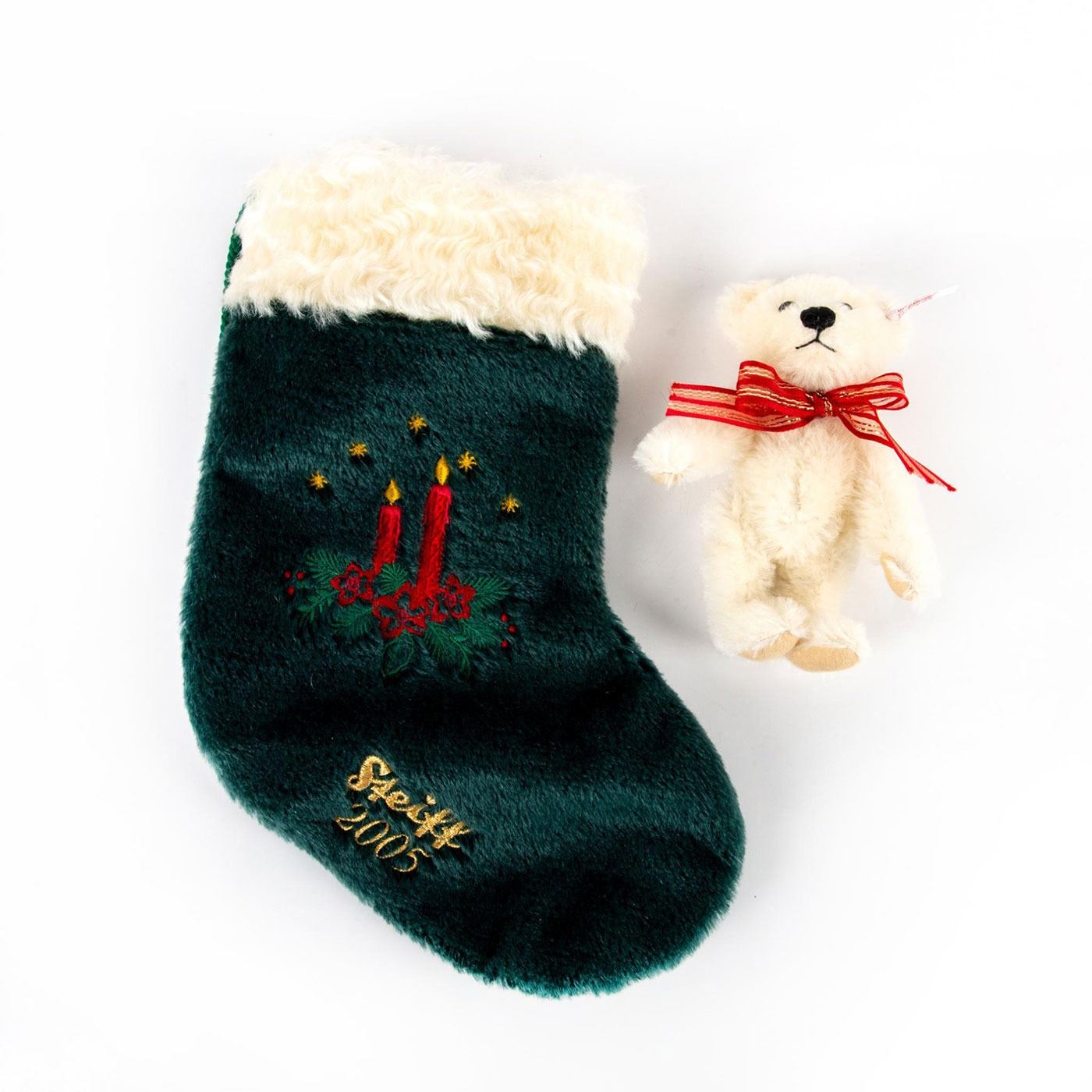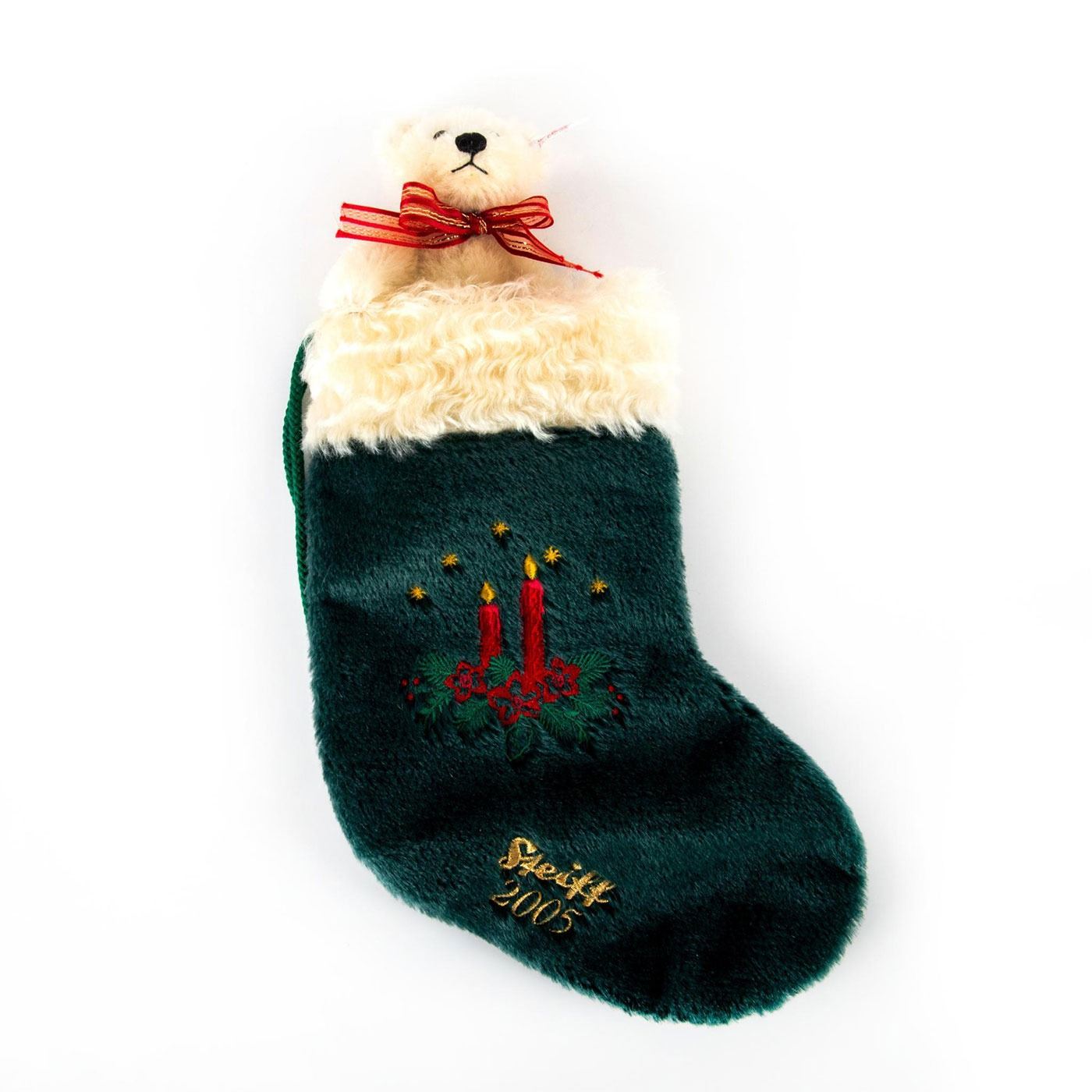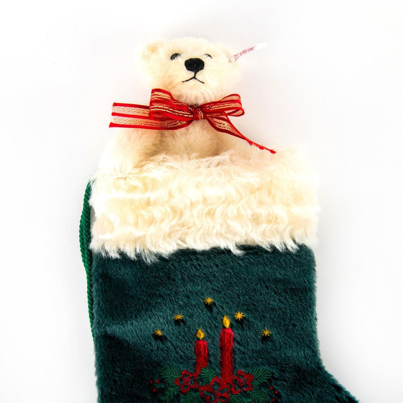 Bear handcrafted from white mohair; white ear tag; gold plated button in ear. Ltd. Ed. Green stocking with embroidered twigs and candles. Includes Certificate of Authenticity and box.