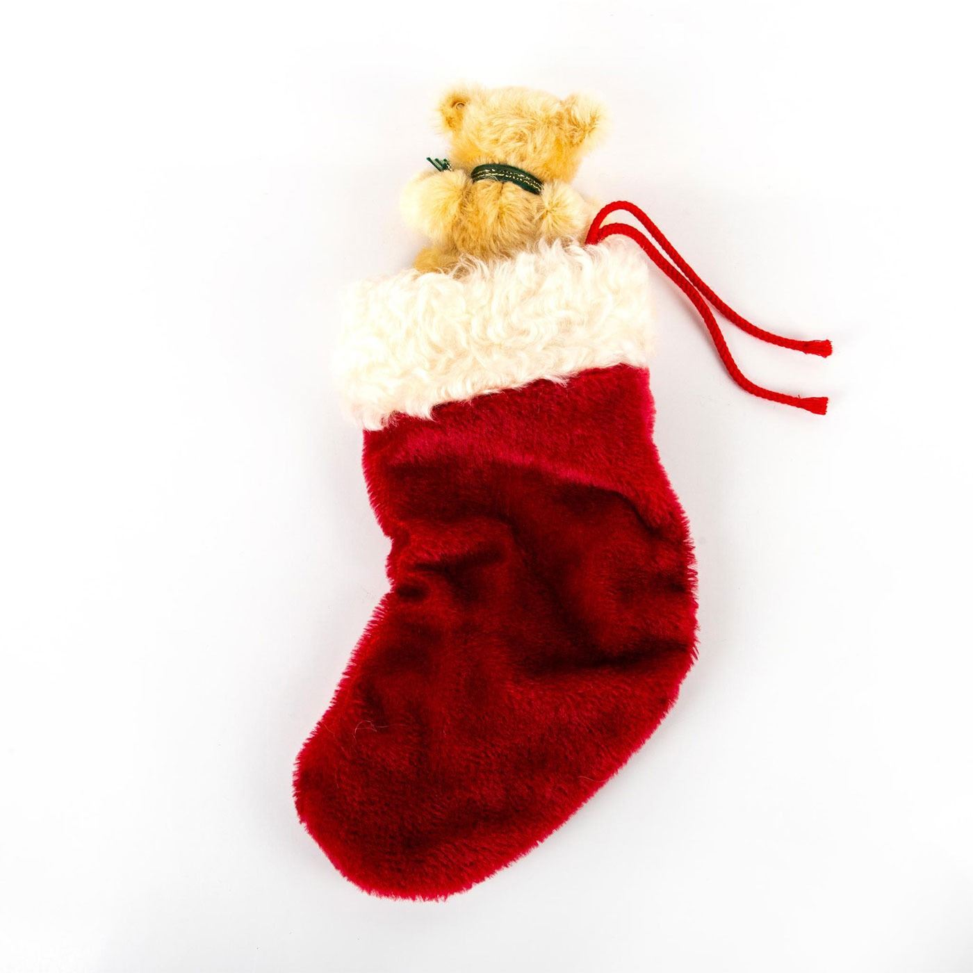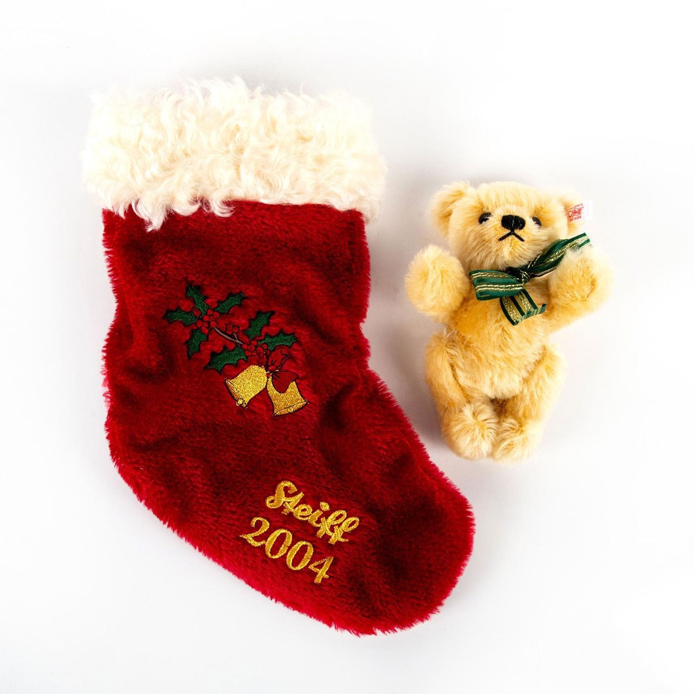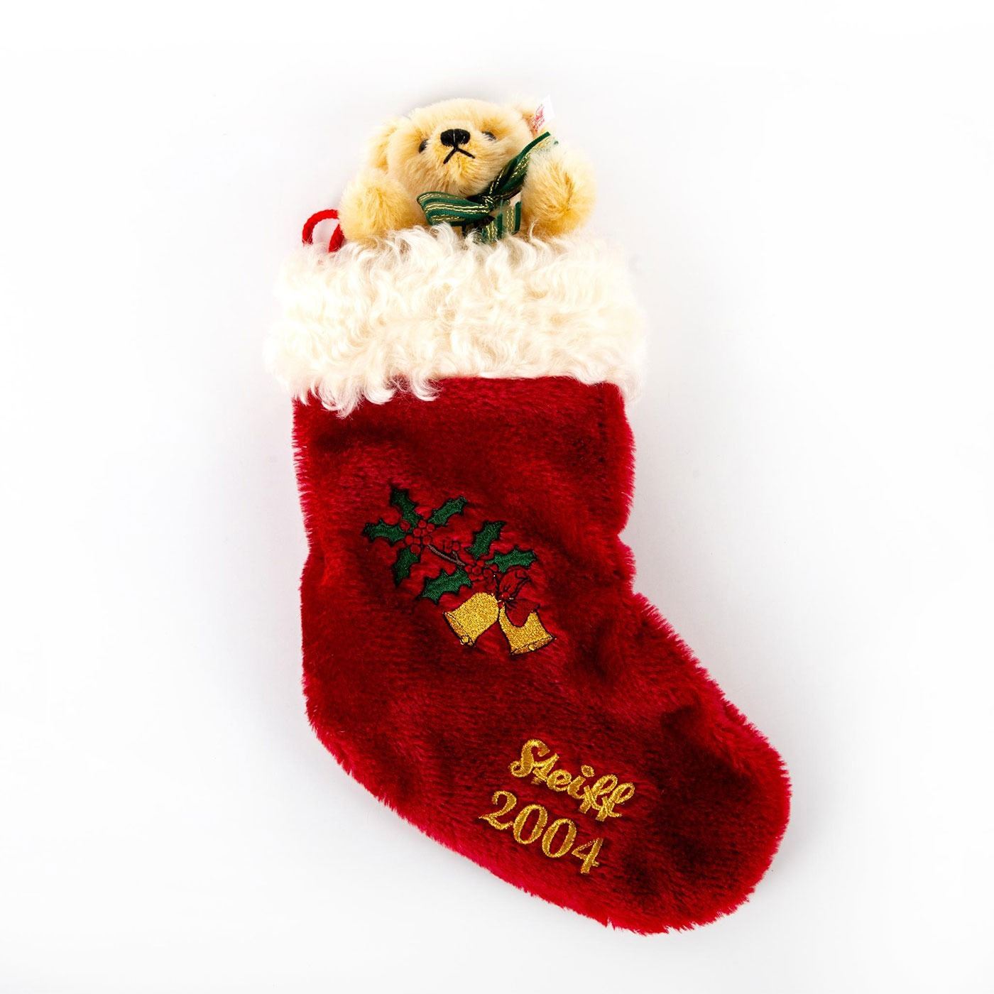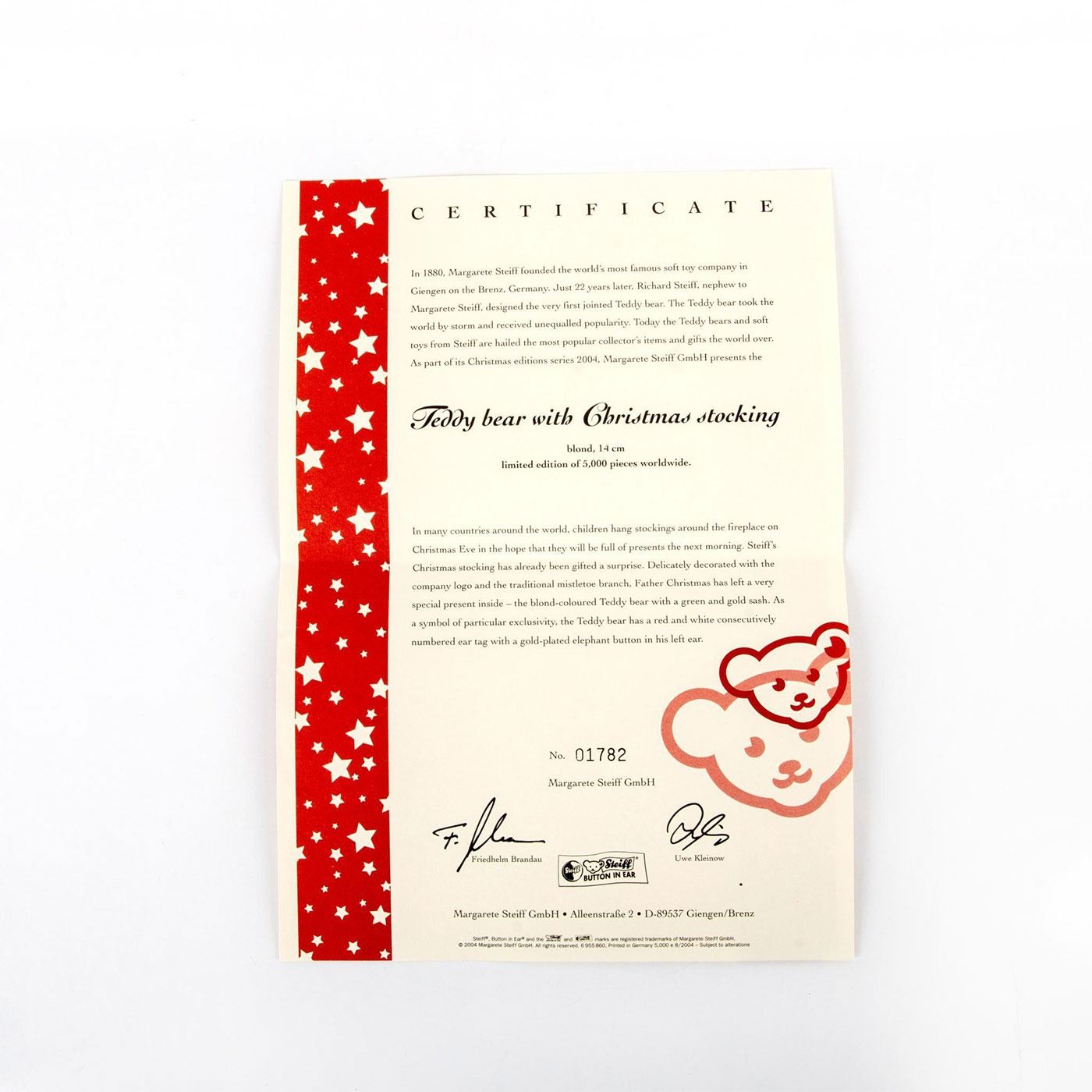 Handcrafted; bear with green bow; white ear tag; gold plated button in ear. Ltd. Edition 1782 of 5000. Red stocking. Includes Certificate of Authenticity and box.