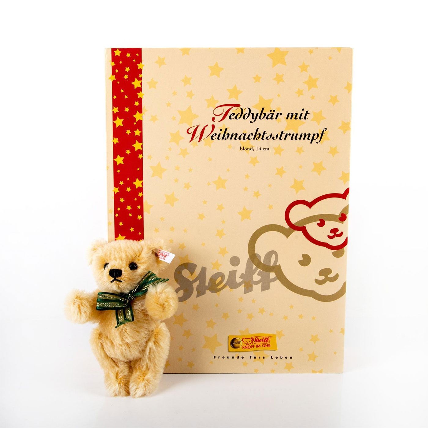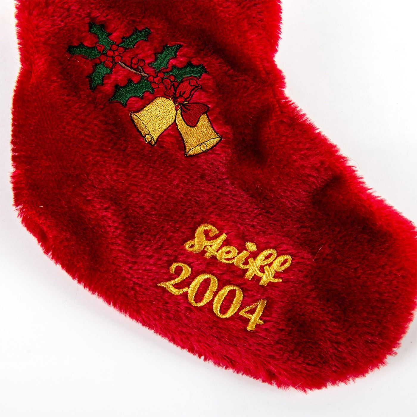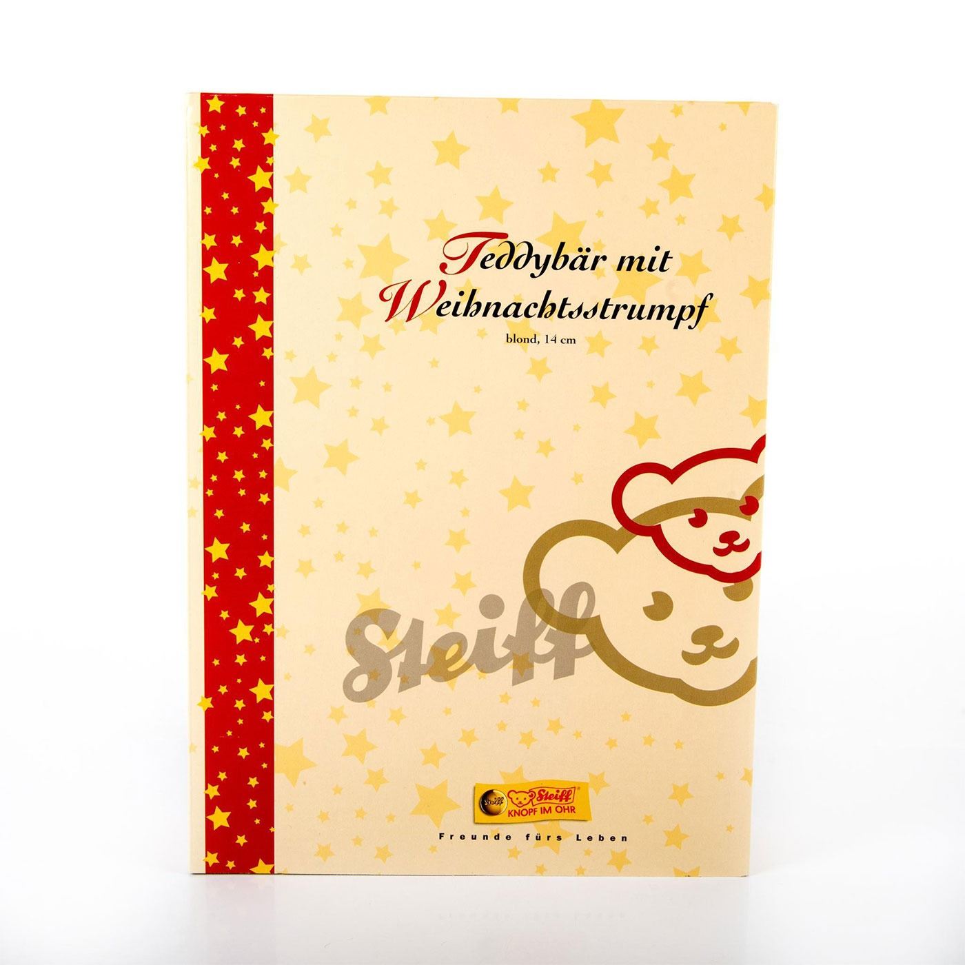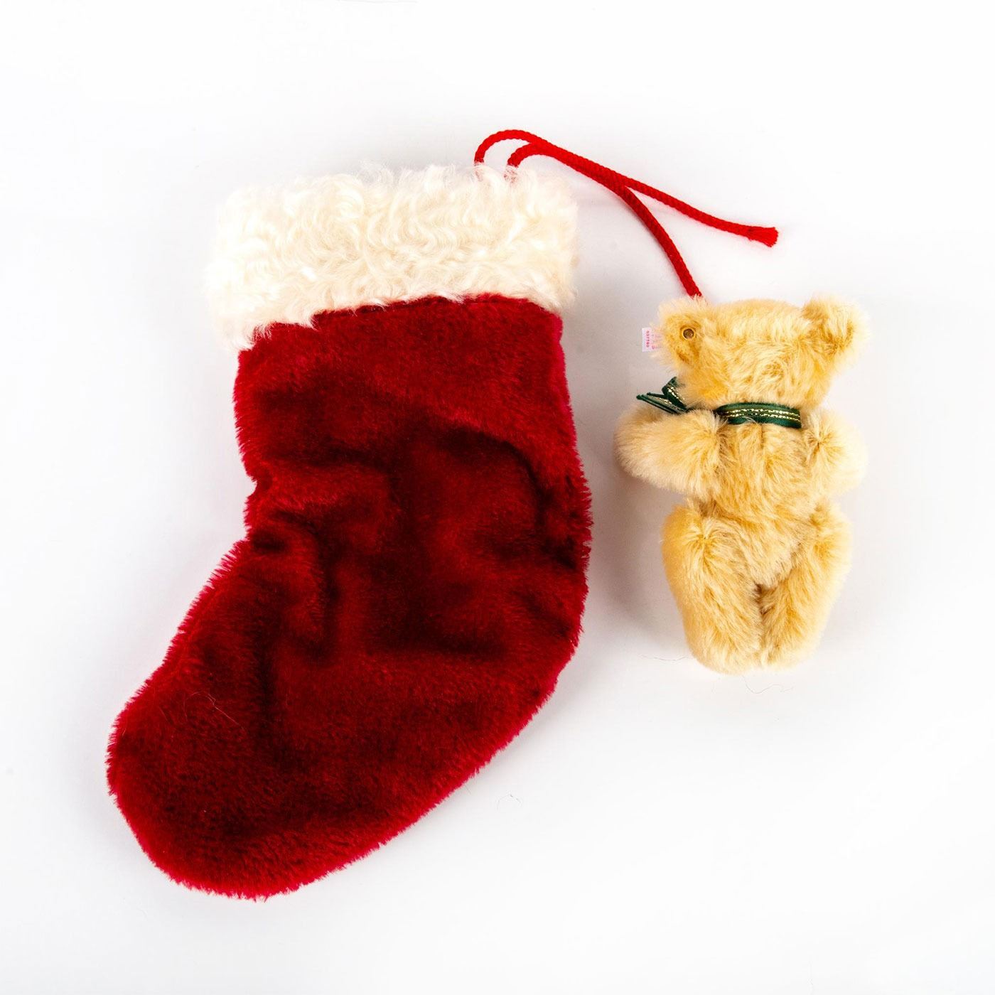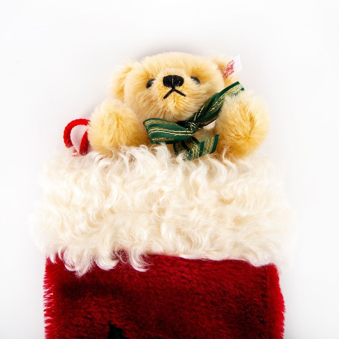 Handcrafted; bear with green bow; white ear tag; gold plated button in ear. Ltd. Edition 1782 of 5000. Red stocking. Includes Certificate of Authenticity and box.