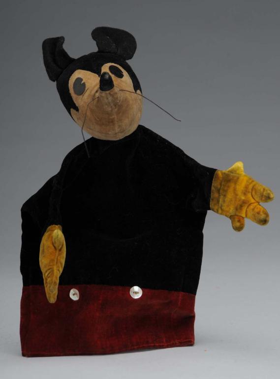 Button in left ear is missing but hole still remains where button used to be. Two whiskers still remain with pie eyes and felt. Moderate soiling to face and hands. Condition (Good - Very Good). Size 9" T.