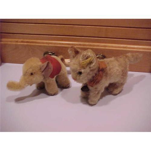 The elephant is about 3.5" tall. He is so cute with his tusks and tail. He is missing his ear button but has the blanket that says " 75 Steiff 1880 to 1955" so I think he is an anniversary elephant. The cat has her ear button, collar and bell. I think both are mohair and in good condition. Very little loss of mohair is noted.