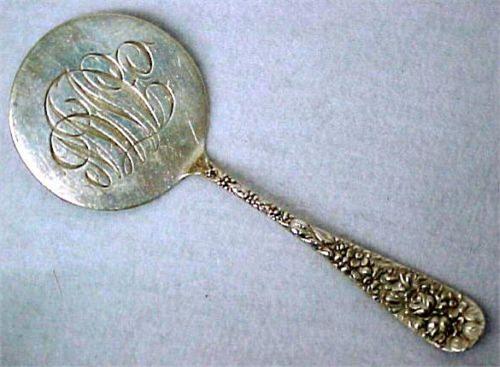 Steiff sterling silver egg server "Steiff Rose"; initialed on round flat serving surface; 7 1/2"; some surface wear; Estimate 120/200"
