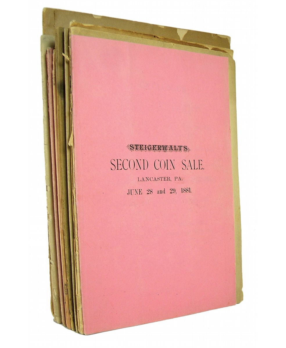 Steigerwalt, Charles. AUCTION CATALOGUES. Seventeen numismatic auction catalogues. Lancaster, 1881-1910. Present are Adams Nos. 2, 3, 4, 8, 22, 24, 25, 32, 34, 41, 44, 49, 51, 62, 65 and 67. All 8vo, in original printed wraps or self-covered, as issued. Sales 4 and 8 are neatly hand-priced in red ink. Generally very good to fine, with a couple exceptions. Seventeen of Charlie Steigerwalt's generally scarce sales, which make for interesting reading. Steigerwalt's location left him far removed from most of the numismatic activity of 19th-century America. As John W. Adams has written, "That an individual could begin, much less carry on for thirty-three years, a coin dealership in the hamlet of Lancaster, Pennsylvania, is pertinent testimony as to the character of the man." Part of his ability to do this lies in his development of what he called the "distribution sale," and which we would now call a mail-bid sale. These made his location less a limiting factor and was probably a key to his success. This lot includes the 1885 Henry Barclay sale, the 1891 George Morris sale and the 1907 W.S. Appleton sale, all rated A- by Adams. Ex David Davis library. Ex Michael Spurlock library.