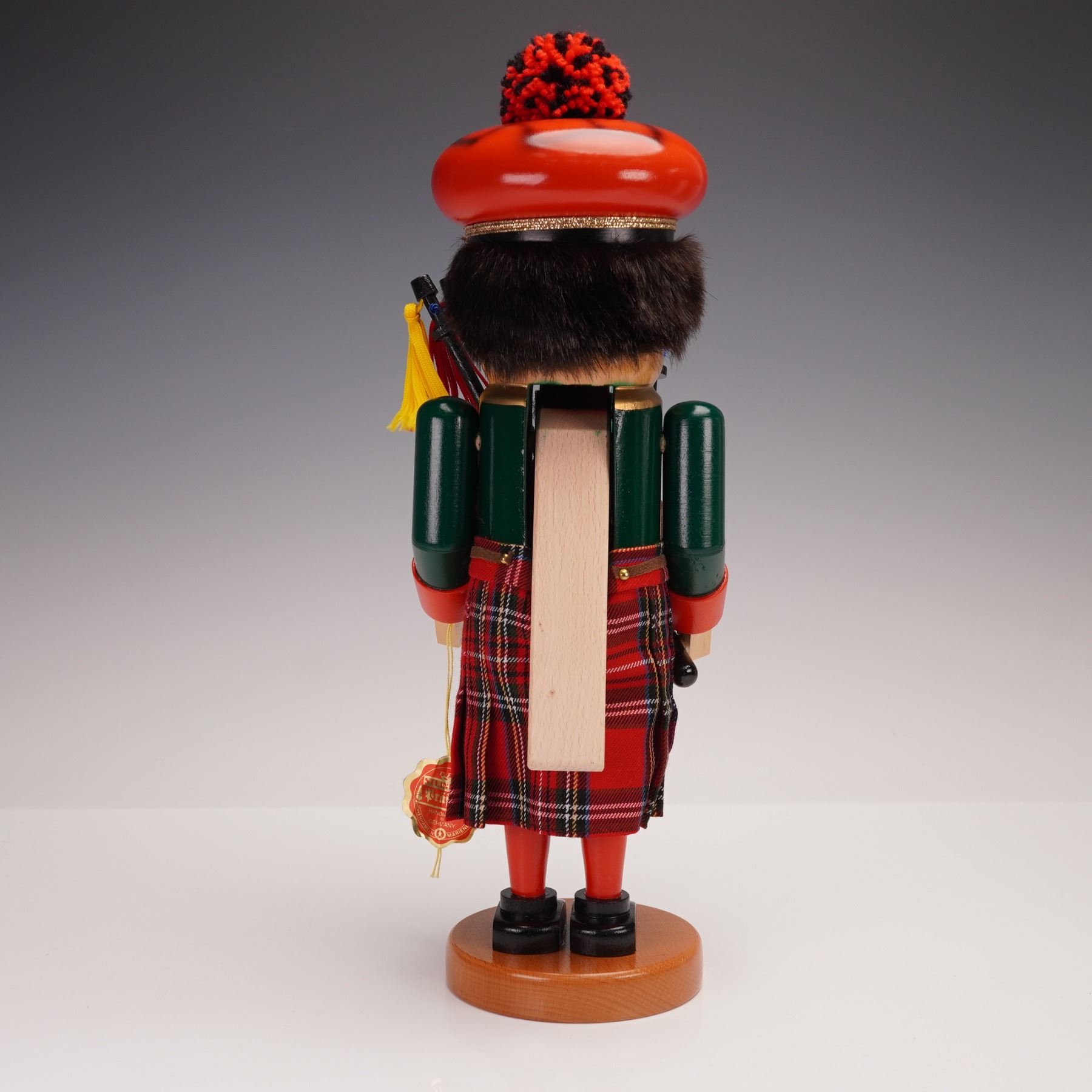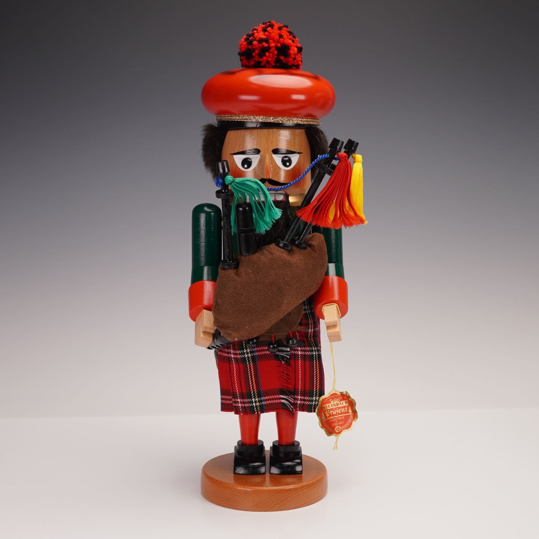 Depicting a traditional bagpiper, crafted in wood with detailed hand-painted features. The figure is dressed in a red tartan kilt, black shoes, a red and black pom-pom beret, and carries a brown fabric bagpipe with multicolored tassels. The lever-operated jaw mechanism is integrated into the back. Markings on the underside include a burned-in Steinbach 'Original Steinbach Volkskunst Germany' stamp, an applied Steinbach Handmade in Germany' sticker, and a hanging Steinbach tag.