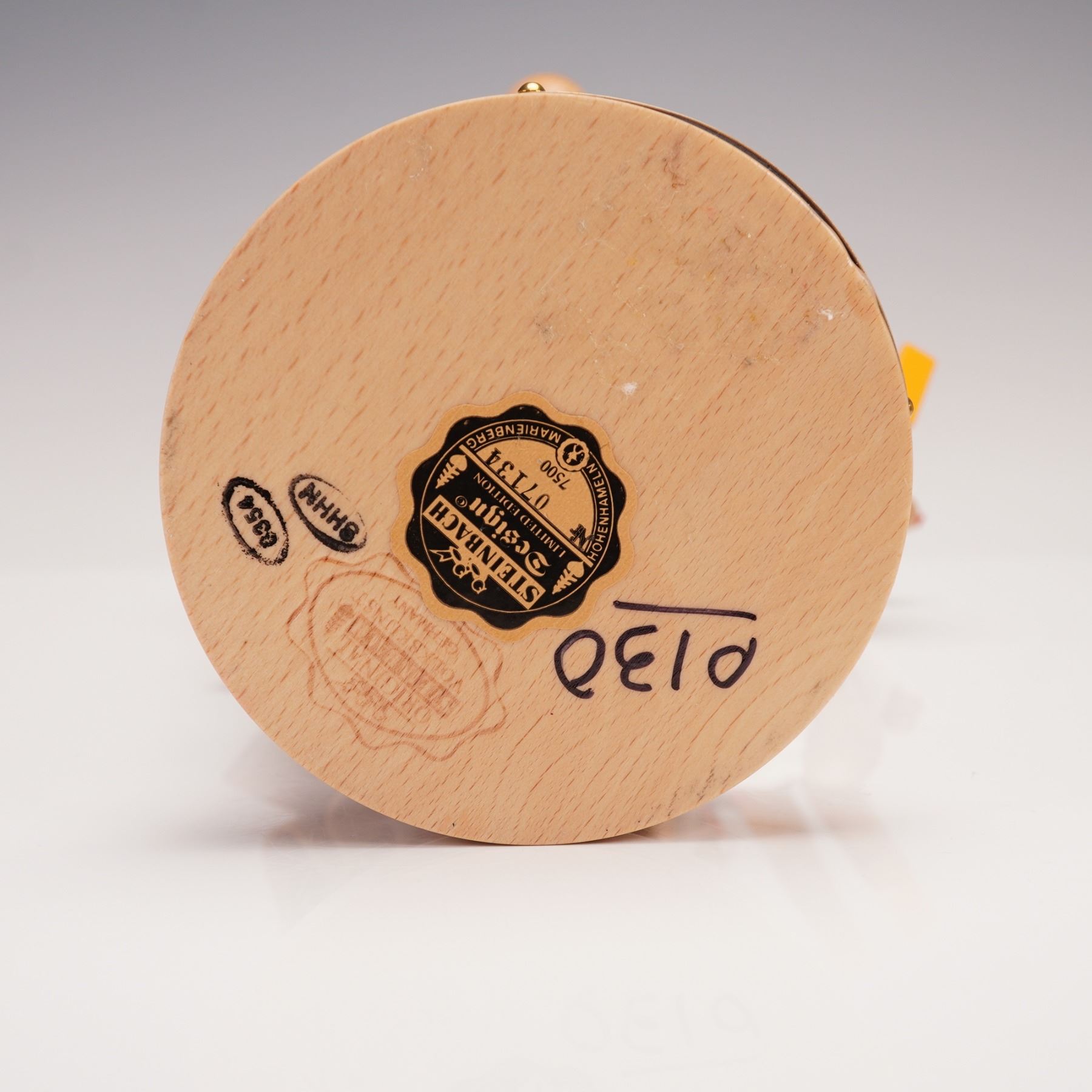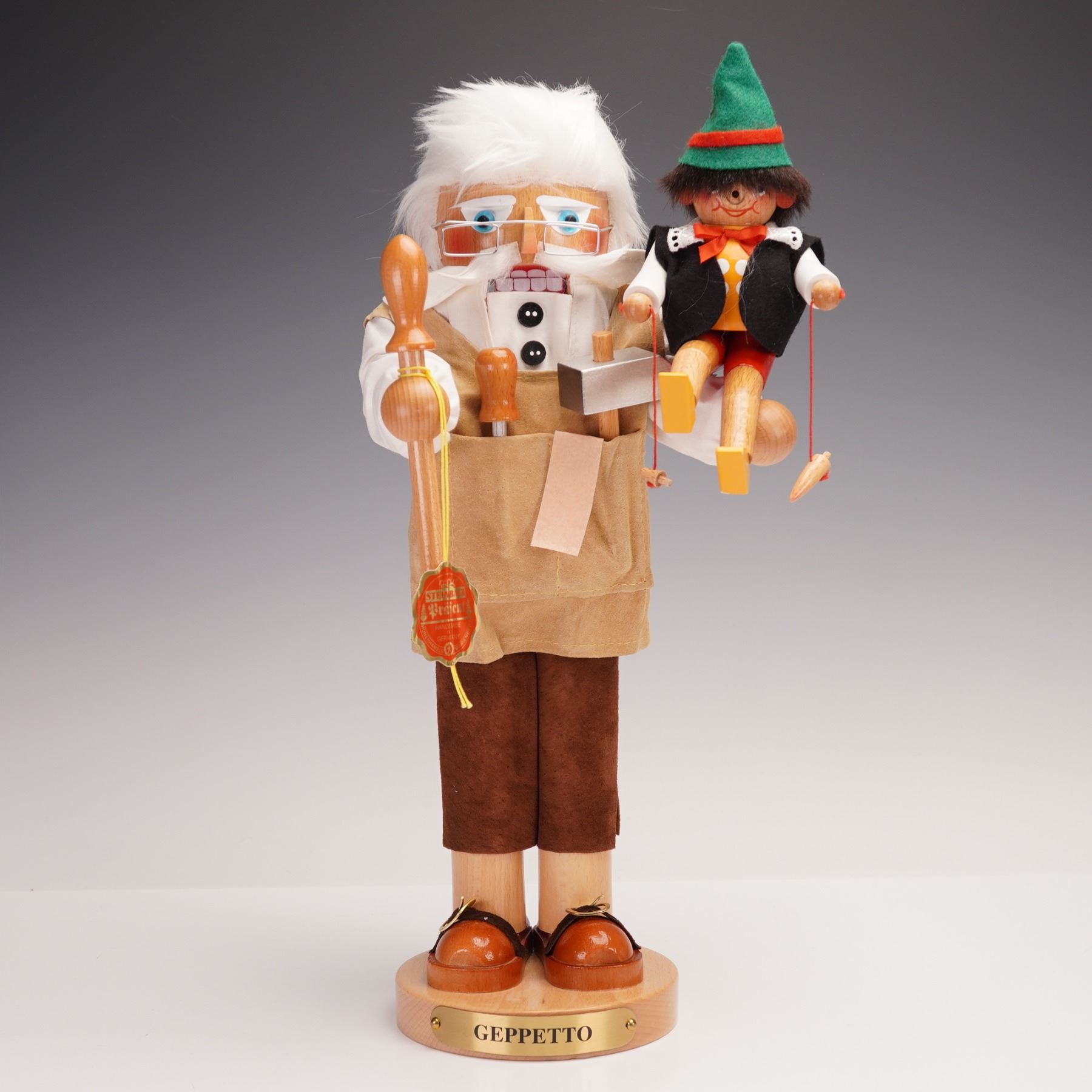 Depicts Geppetto holding Pinocchio. Expertly carved from wood, the figure is hand-painted and finished with applied details. Geppetto is shown with white hair, glasses, apron, and tools, while Pinocchio features a green felt hat, black vest, red shorts, and yellow shoes. Suspended by red strings, Pinocchio displays both a short and long nose variation. The piece stands on a round wooden base with a brass plate engraved 'GEPPETTO.' Markings on the underside include a burned-in 'Original Steinbach Volkskunst Germany' stamp, an applied Steinbach Handmade in Germany sticker and hanging tag, factory stampings, and handwritten limited edition numbering.