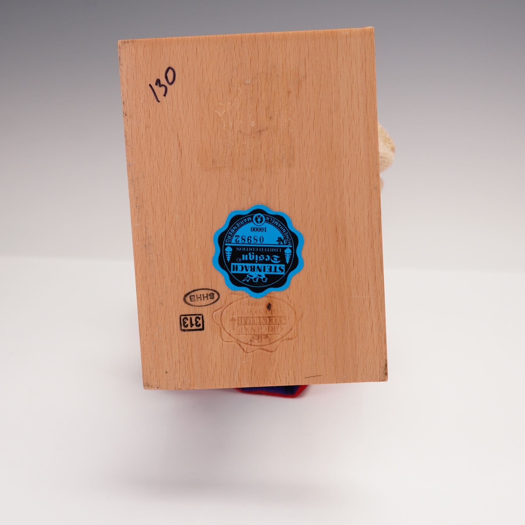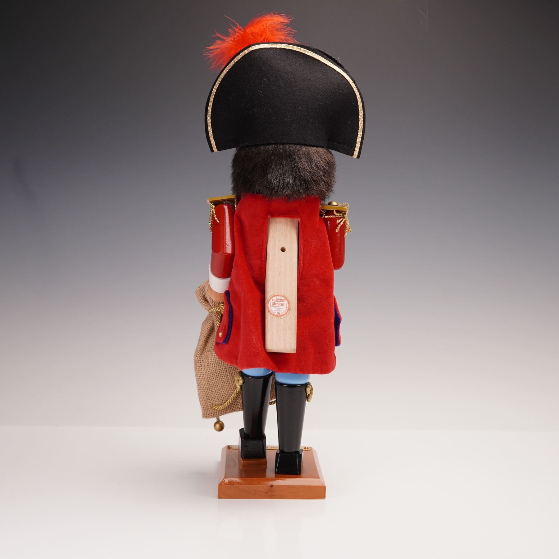 Handcrafted wooden nutcracker figure dressed in a red coat with gold epaulets, white vest with brass buttons, blue trousers, and black boots. The figure wears a tall black bicorn hat with gold trim and a red feather plume, and carries a burlap sack decorated with a flower motif and filled with miniature items. Mounted on a square wooden base with a plaque identifying the figure as 'The Toy Soldier.' Markings on the underside include a burned-in 'Original Steinbach Volkskunst Germany' stamp, an applied Steinbach Handmade in Germany sticker, and an edition numbered label.