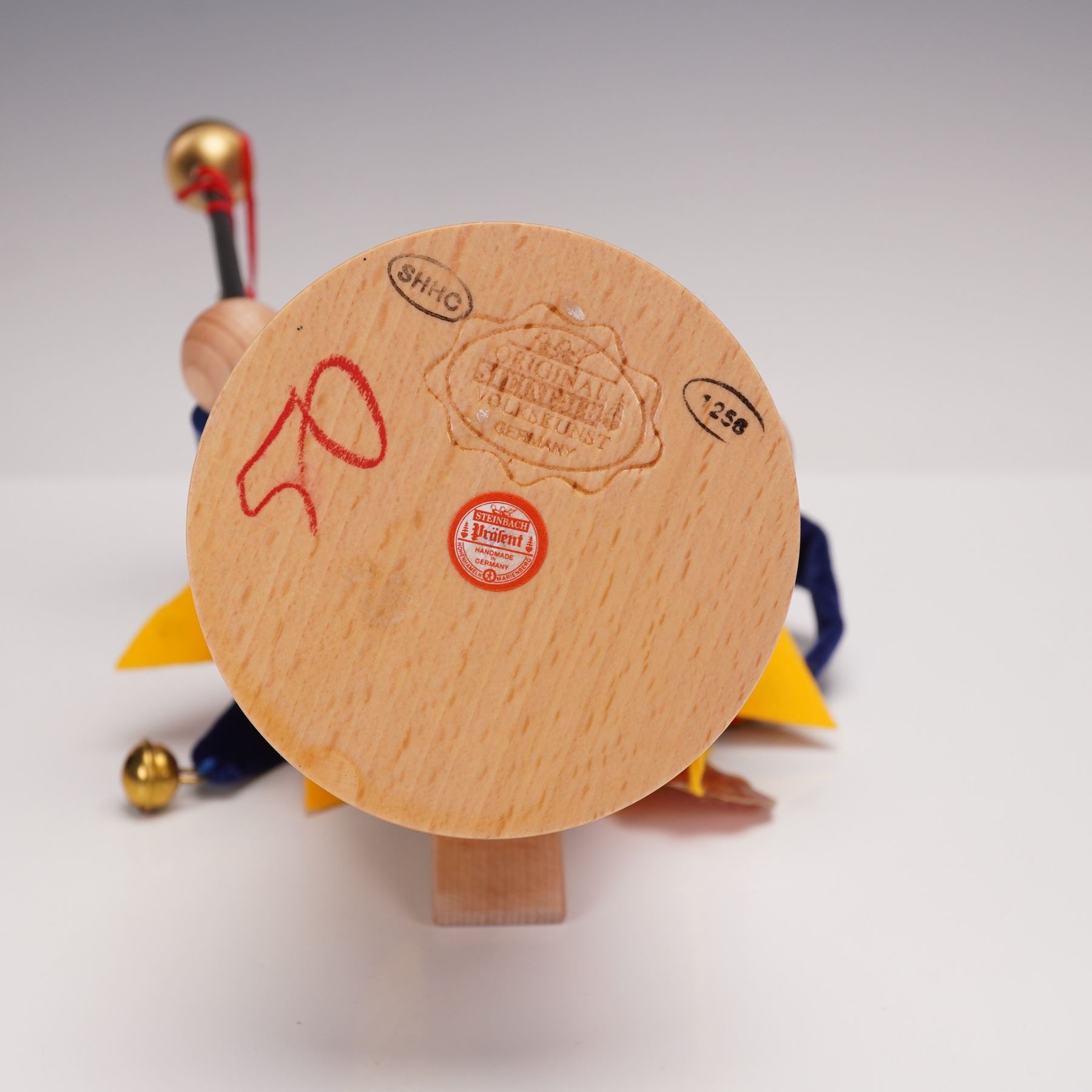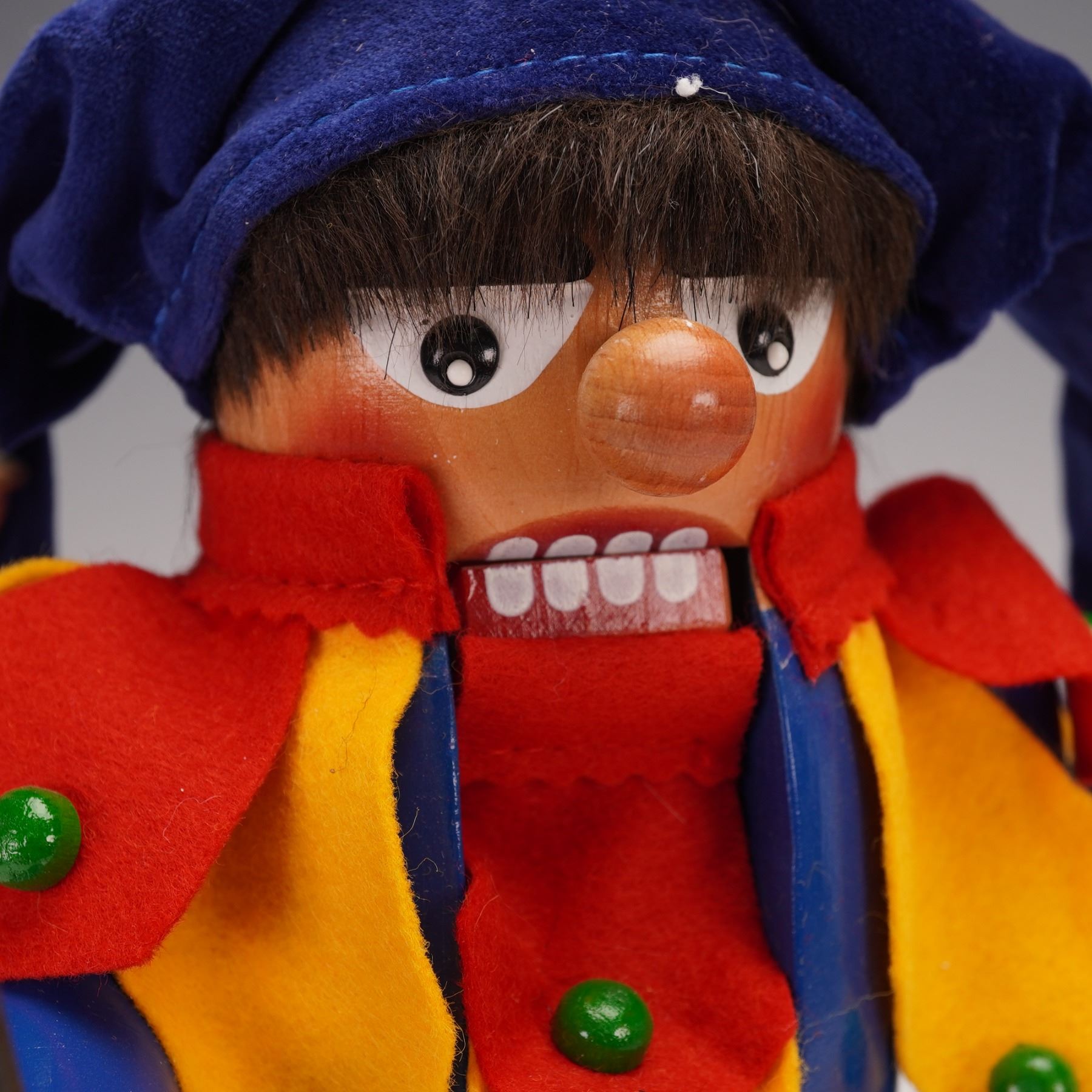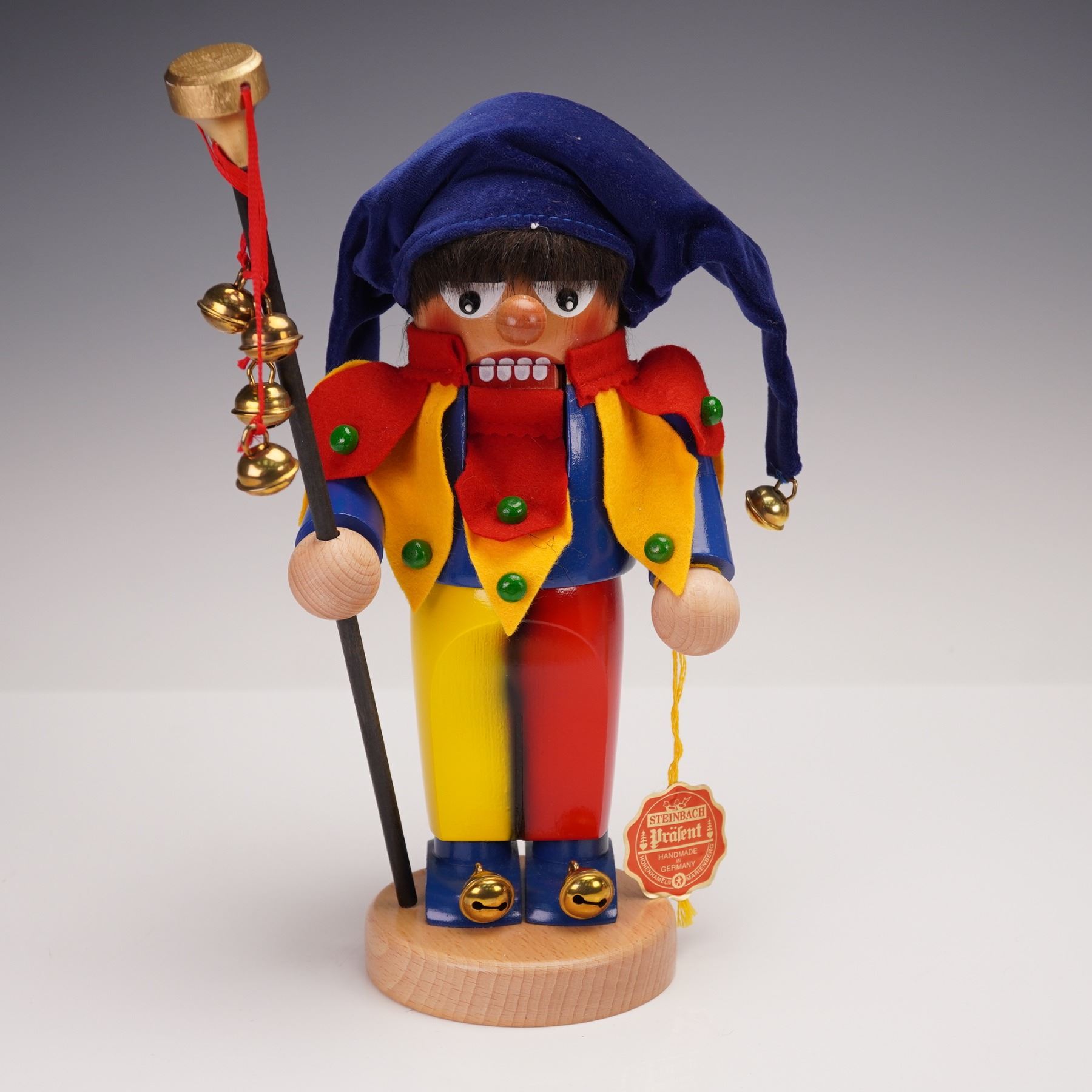 This charming Steinbach nutcracker is styled as a colorful jester, featuring a vibrant blue and yellow costume with red and green felt accents. The jester holds a staff adorned with jingle bells, adding to its festive appeal. The piece is mounted on a wooden base with the original Steinbach tag, confirming its authenticity. A delightful decorative piece, perfect for holiday collections or as a whimsical accent to any room. Steinbach is a renowned German company with a legacy of over 200 years, known for its finely crafted nutcrackers. Each piece is carefully handcrafted with up to 130 steps, making them highly collectible. Their commitment to traditional craftsmanship and vibrant designs has made Steinbach nutcrackers a treasured item in homes around the world.