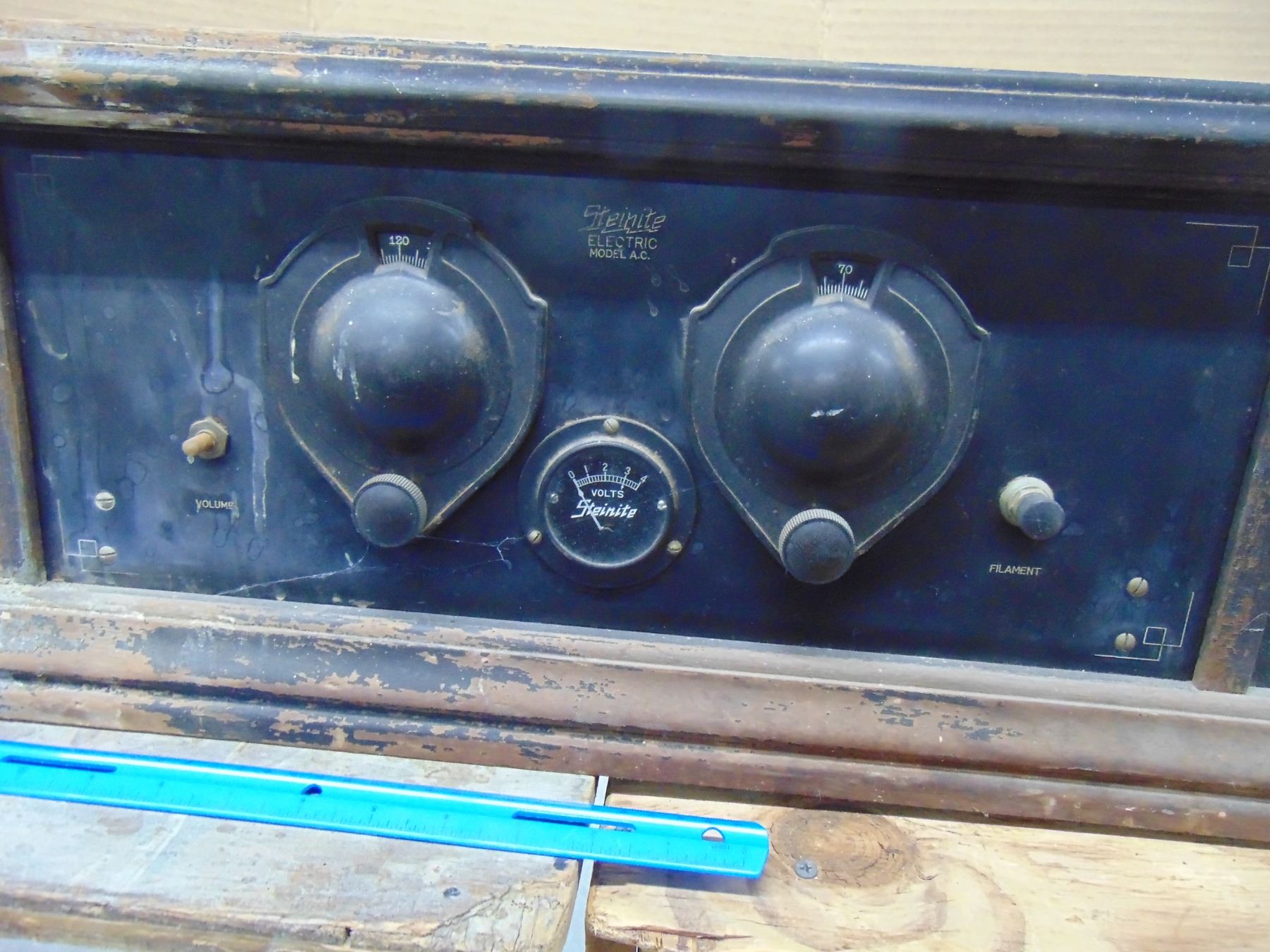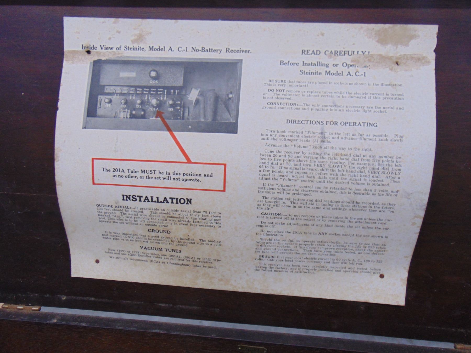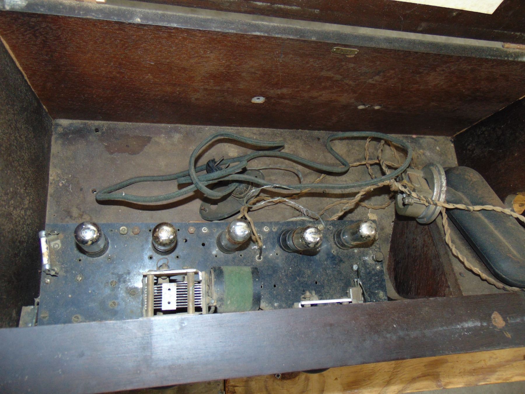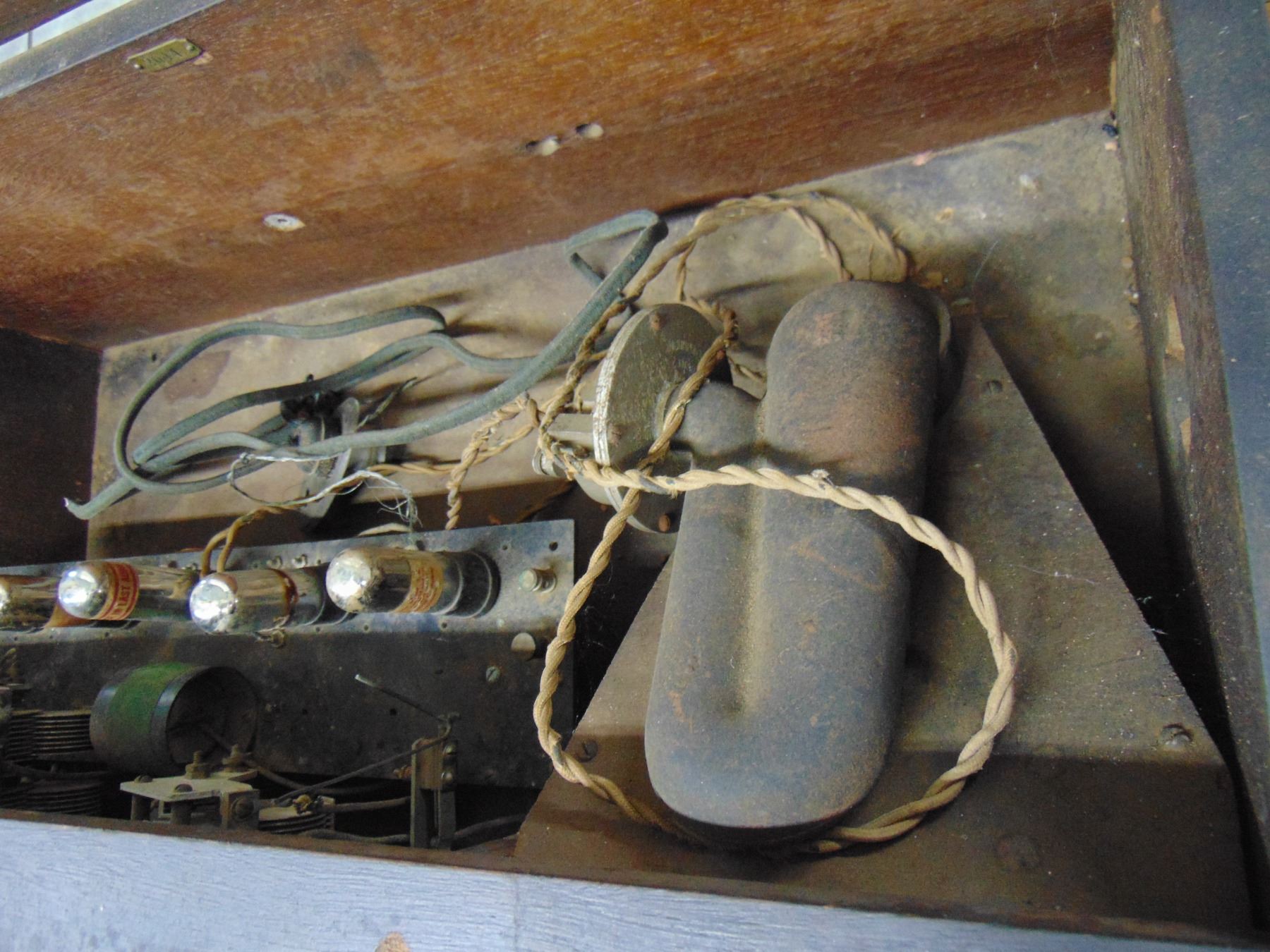 Early battery wood set; model A.C.-1; includes built-in horn speaker; complete with 199 and 120 tubes