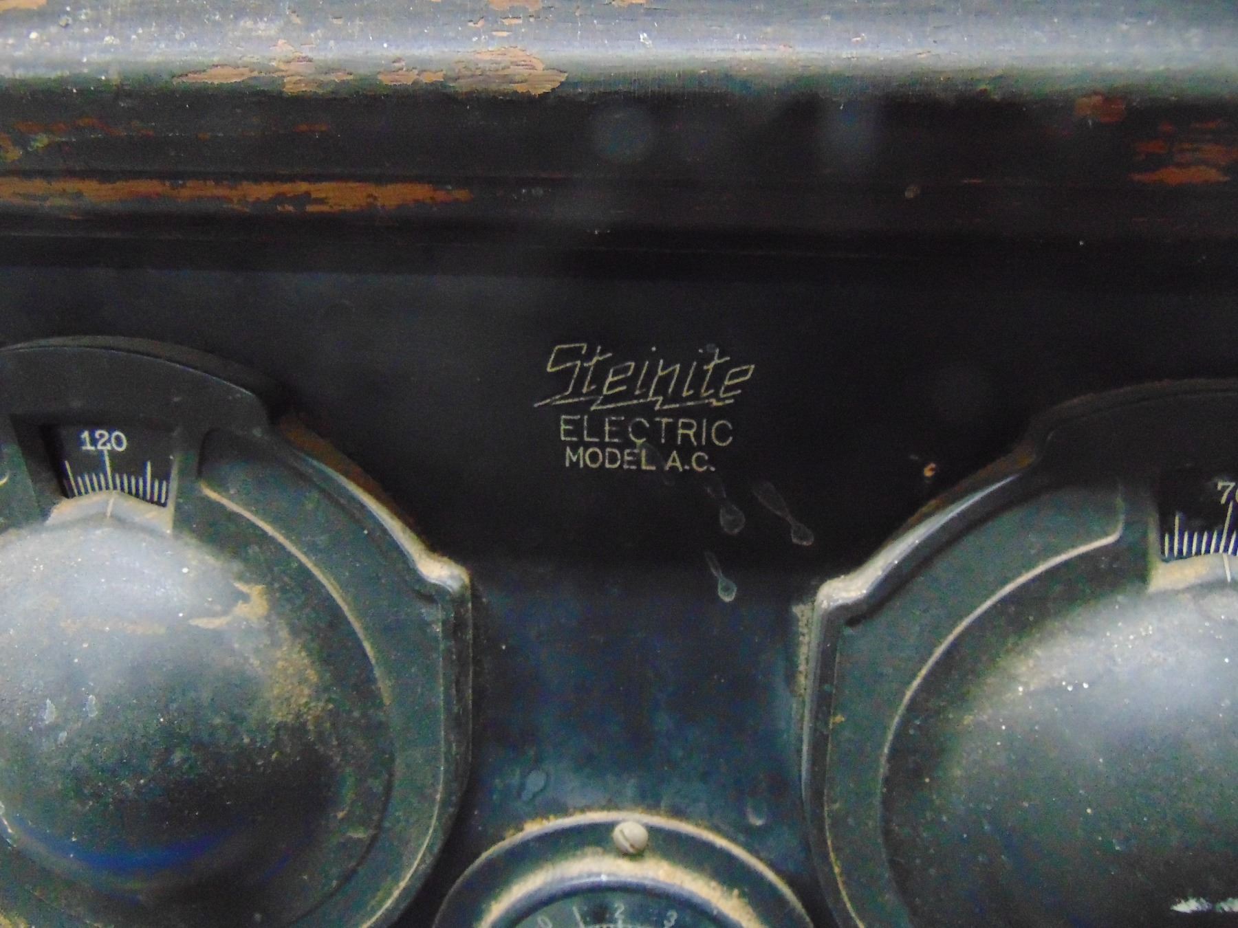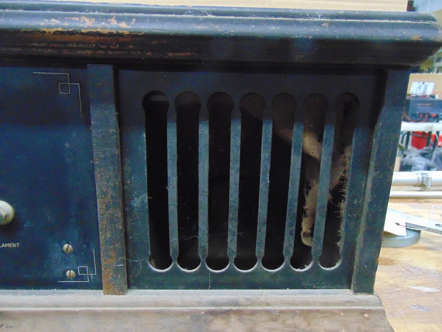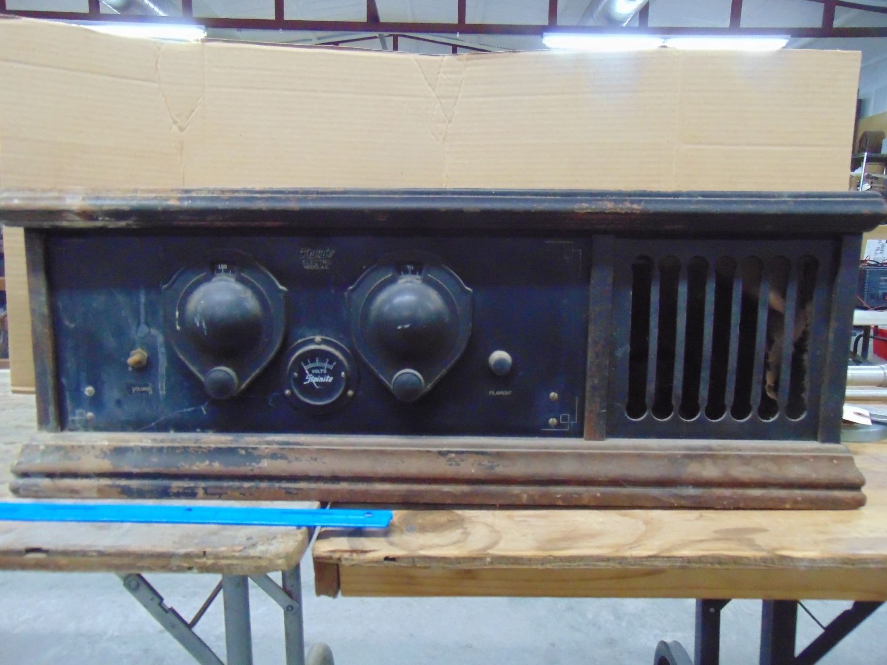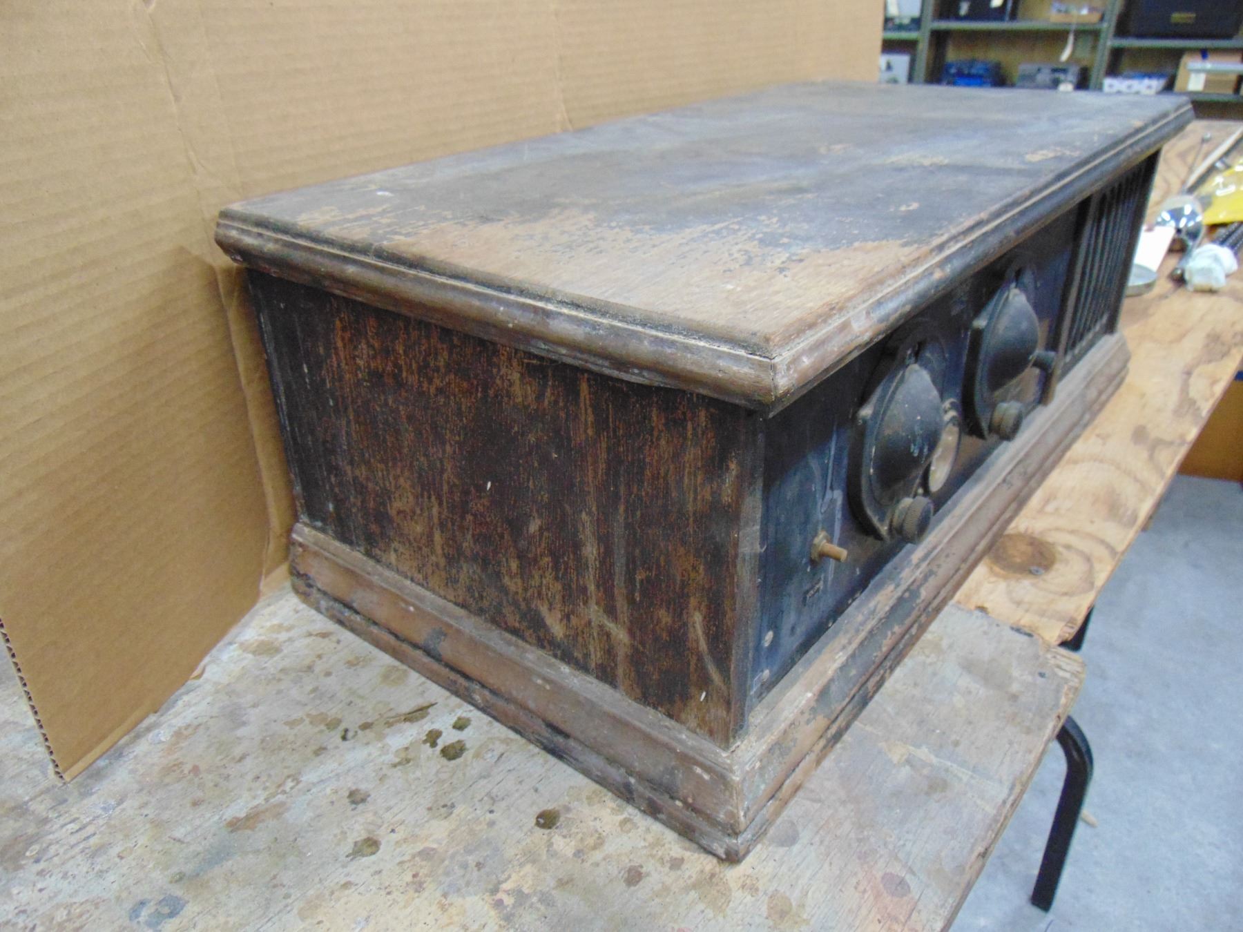 Early battery wood set; model A.C.-1; includes built-in horn speaker; complete with 199 and 120 tubes