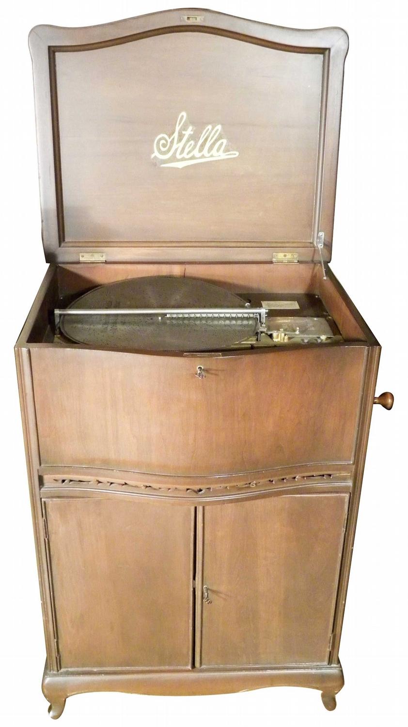 Music Box Stella Bow Front Large Floor Model Phonograph. Walnut case with disc storage below. Last patent Aug 14, 1900, #16773. Plays 17 inch disc. Comes with 6 discs. Split down back sound board that does not affect sound of music, case had been refinished otherwise very good working condition comes with key. 27 1/2 X 37 X 21 inches closed.