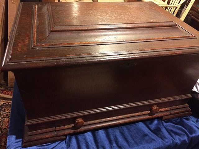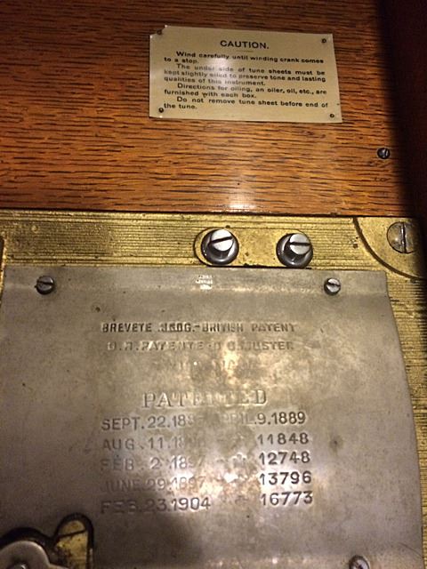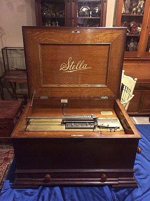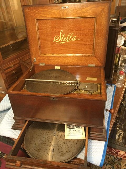 Stella Music Box. Originally from Washington, CT, Tim had his eye on this piece for 30 years. When the owner passed, he missed it's sale and had to track it down. He was fortunate enough to track it down and be able to purchase it for this sale. It was never for sale and always part of a personal collection. Solid oak, original finish, comes with 11 music disks. Stunning piece in original finish in working order, plays beautifully. Wonderful time of year for this great piece! Comes with reprinted catalog from Stella Music Company. Measures approx. 28 1/2" wide x 21" deep x 15" tall.