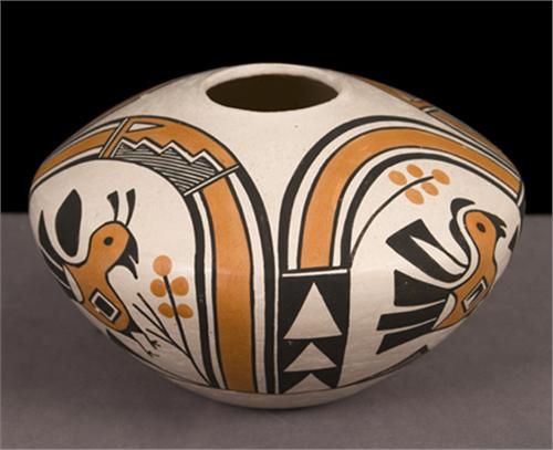 Stella Shutiva (1939-1997). Acoma Pot. 5 1/2" x 8 1/2". Multicolor designs on white slip. Signed. (est $2,000-3,000)