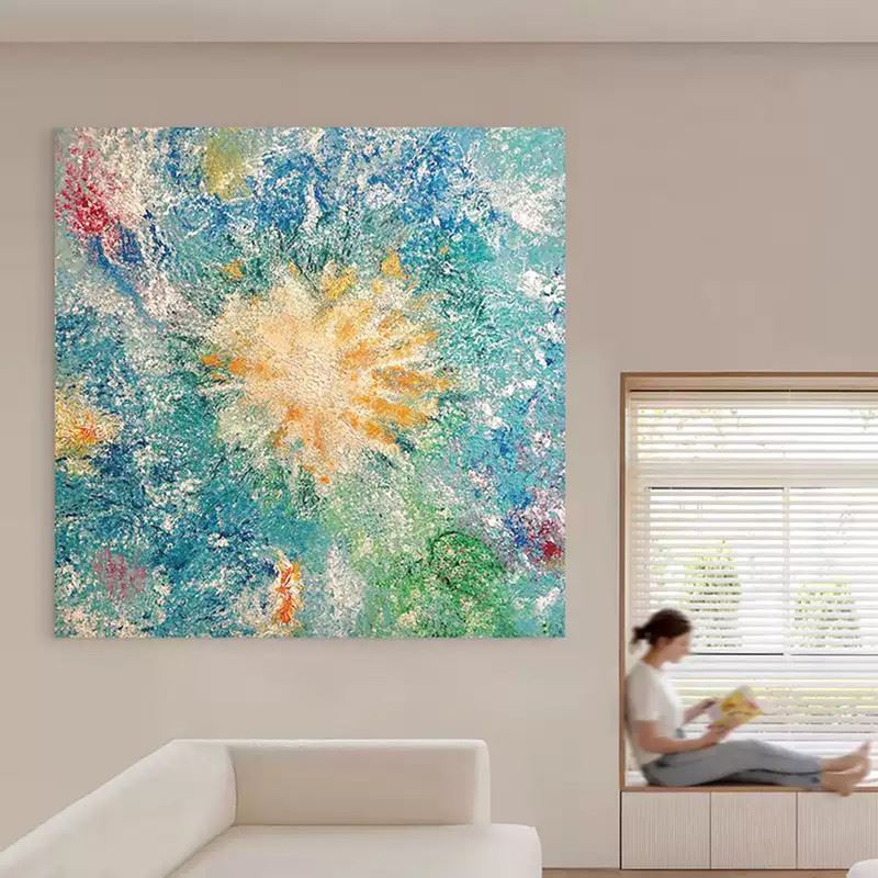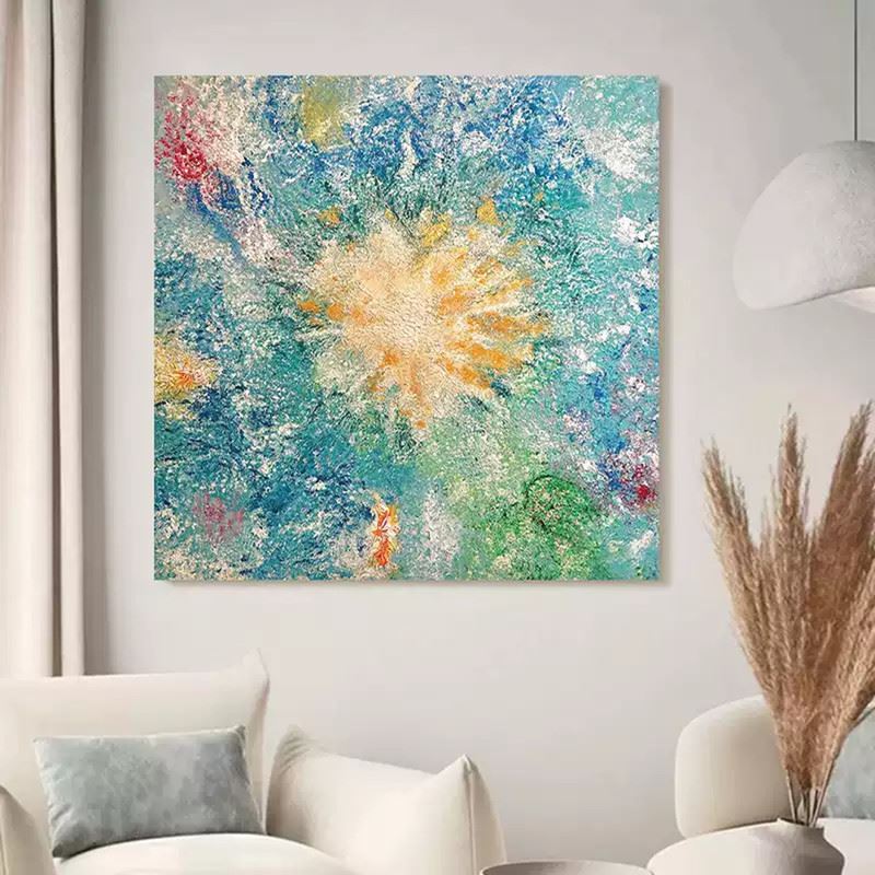 Amid swirling blues, a soft burst of gold and white blooms at the center, like starlight in motion sending gentle ripples through the cosmos. Dimensions: 24 x 24 inches.
