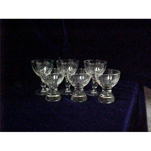 This cocktail glass set comes with 6 stemmed glasses. In addition there is an etching on the front of the glass. 3 of the glasses measure 3.5? tall by 3? in diameter. The other 3 glasses are 4.25? tall and 3? in diameter. In good condition. Maker and year are unknown.