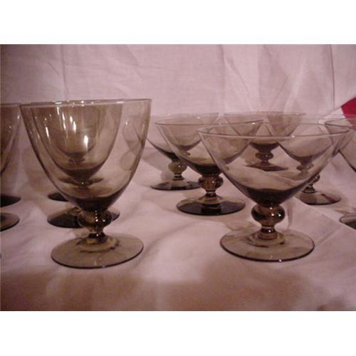Stems and snack plates in a smoke color. Unknown maker. 7 Champagnes,7 Wines and 9 Snack Plates. One tiny nick on the foot of one glass, otherwise in fantastic condition.