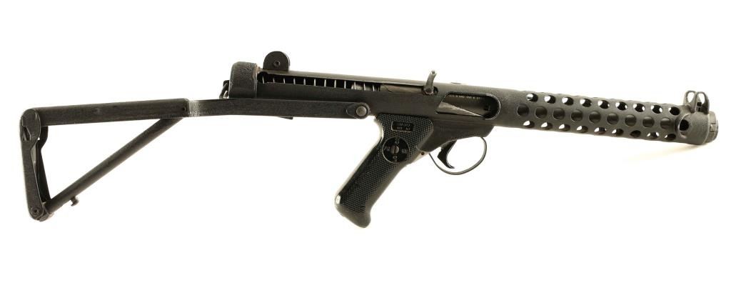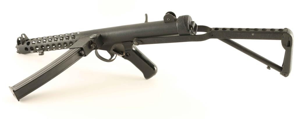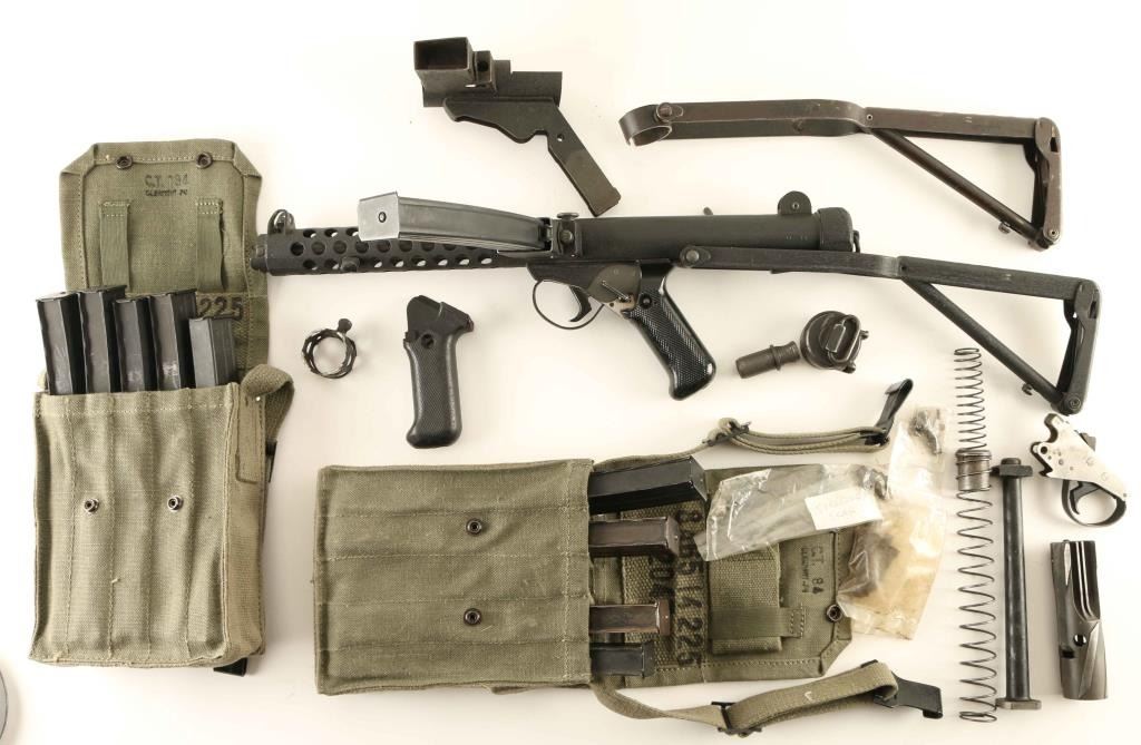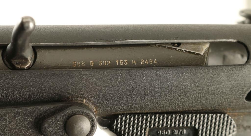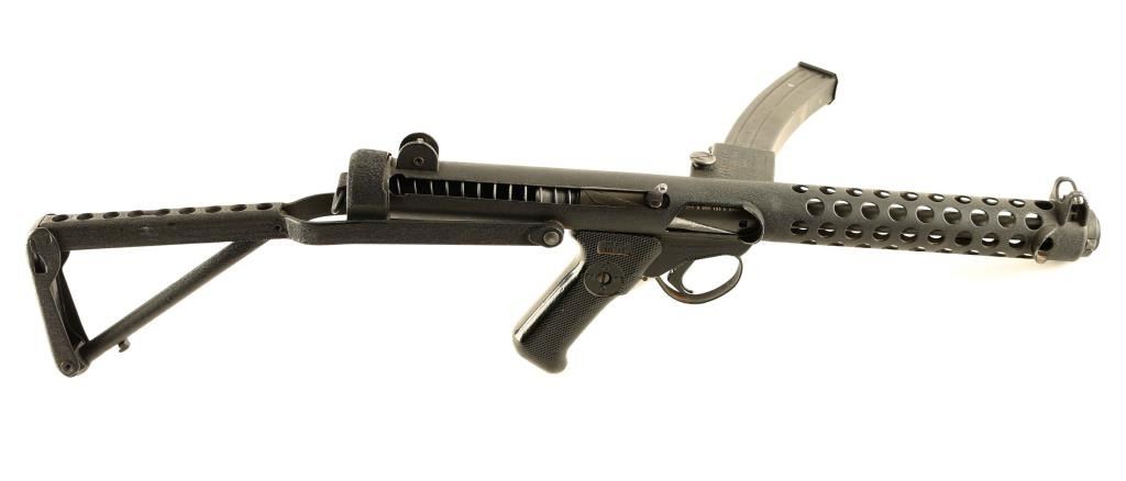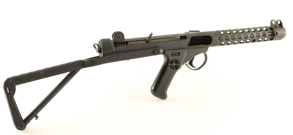 'Fully Transferable' "Stenling" Select fire clone of the British military Sterling Mk 4 (L2A3) open bolt submachine chambered in 9x19mm, utilizing a registered Sten receiver & Sterling parts. Features a black crinkle finish, 7.75" barrel with shrouded muzzle, protected post front sight, folding "L" dual leaf rear aperture sight with settings for 100 & 200 meters, bayonet lug, smooth trigger, three position selector on the left side of the trigger housing, push button magazine release, side feeding 34 round magazine, smooth charging handle, tubular receiver with integral ventilated handguard & hand-stops, checkered black plastic pistol grip and under-folding collapsible metal shoulder stock. Includes two magazine pouches, 10 spare magazines and a Sterling parts kit. Machine gun exhibits approximately 95% of black finish showing scattered handling marks/chips and some of the texture work flat. Action is sound, the bore is excellent and the plastic grip is very good. Condition is Excellent. ***NRA Firearm***