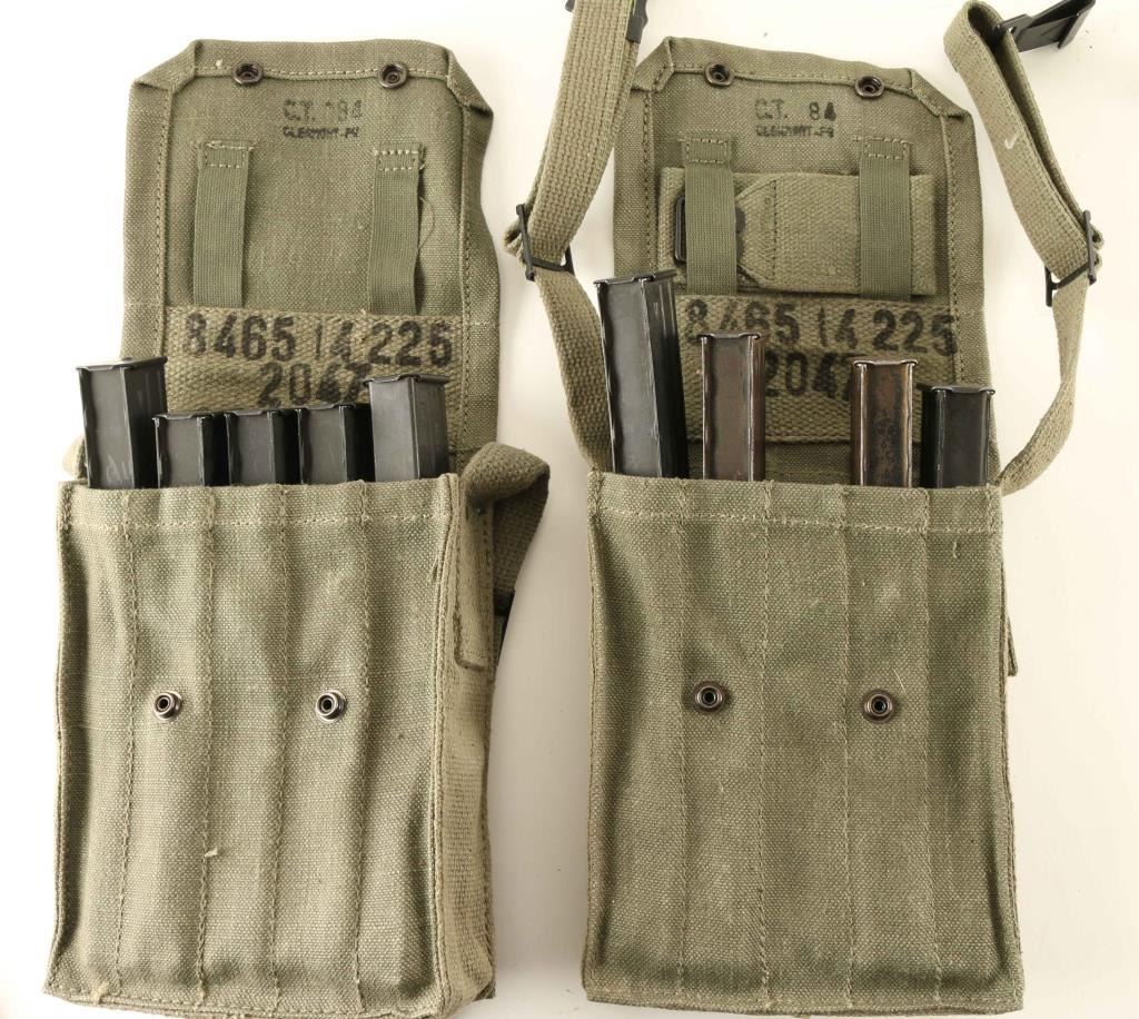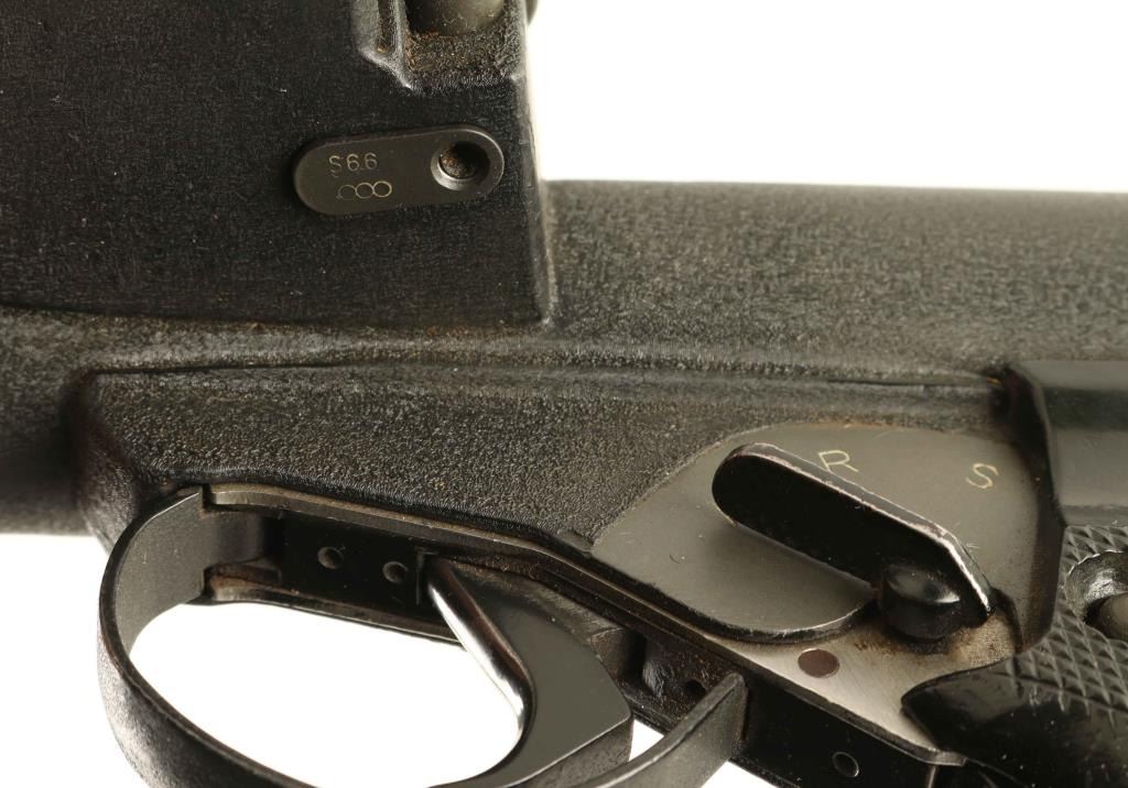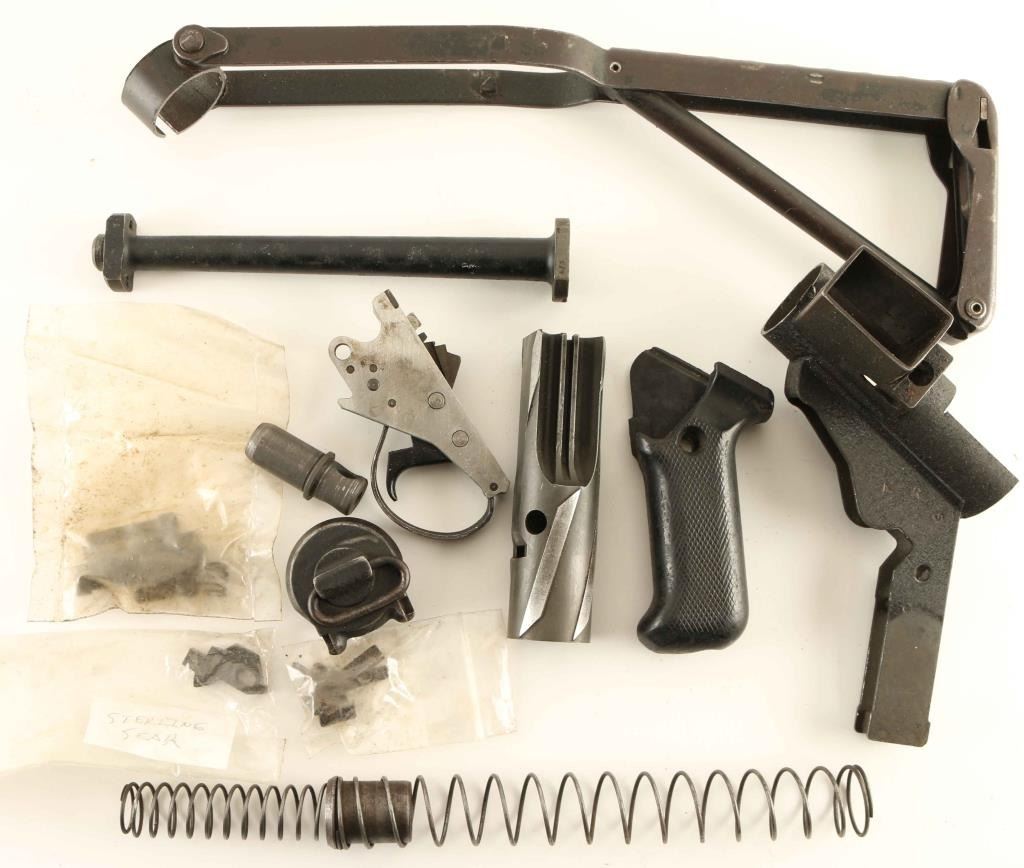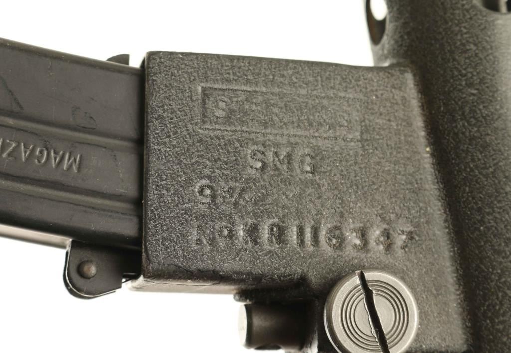 'Fully Transferable' "Stenling" Select fire clone of the British military Sterling Mk 4 (L2A3) open bolt submachine chambered in 9x19mm, utilizing a registered Sten receiver & Sterling parts. Features a black crinkle finish, 7.75" barrel with shrouded muzzle, protected post front sight, folding "L" dual leaf rear aperture sight with settings for 100 & 200 meters, bayonet lug, smooth trigger, three position selector on the left side of the trigger housing, push button magazine release, side feeding 34 round magazine, smooth charging handle, tubular receiver with integral ventilated handguard & hand-stops, checkered black plastic pistol grip and under-folding collapsible metal shoulder stock. Includes two magazine pouches, 10 spare magazines and a Sterling parts kit. Machine gun exhibits approximately 95% of black finish showing scattered handling marks/chips and some of the texture work flat. Action is sound, the bore is excellent and the plastic grip is very good. Condition is Excellent. ***NRA Firearm***