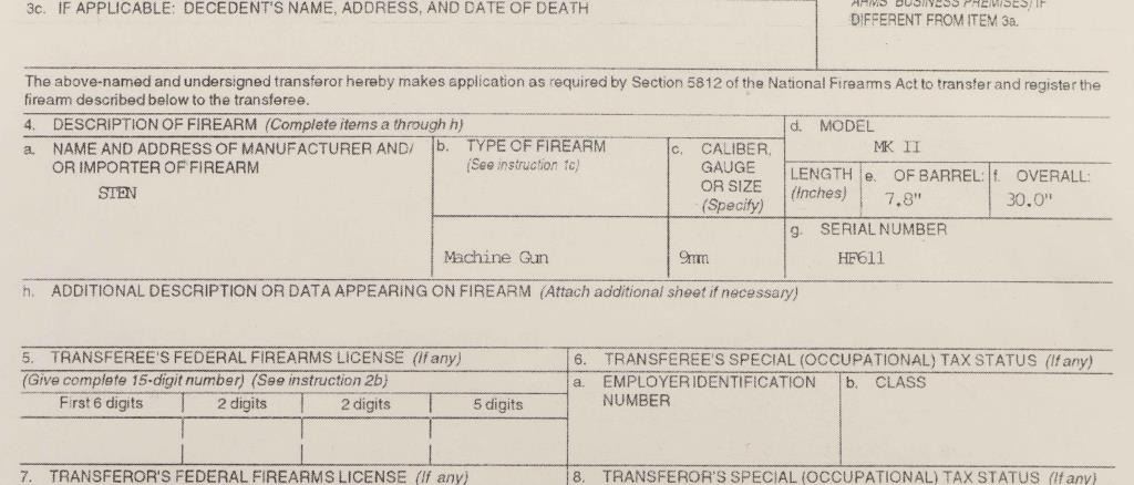 14.Class III designated firearms must be registered in compliance with the NFA registry. A $200 dollar federal tax payment is required each time a functional NFA firearm or suppressor to or from us. The fee as well as the payment is due at the time of purchase in order to process paperwork. The new owner will be required to complete 3 forms; (1) ATF Form 4, (2) fingerprint card , (3) ATF form 533.20 certificate of compliance. These forms will be provided to you by the auction house. The Chief law enforcement of purchasers municipality signature is required on a form 4. If state of local law requires a permit or licence to purchase that also must go with the application. The buyer than mails the paperwork into the ATF. The auction house will then receive one copy of the form 4 back with the tax stamp attached to it. This is then given to the new owner when he or she picks it up. The following states do not allow individuals to own machine guns California, Hawaii, Illinois, Iowa, New Jersey, Kansas, Maine, Michigan, New York, and Rhode Island. Also all funds will be kept by the auction house until the final approval has been received.