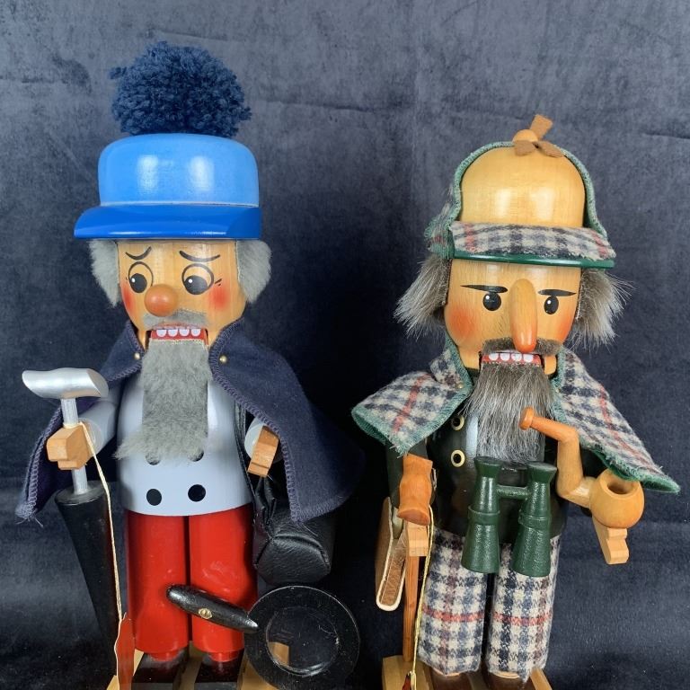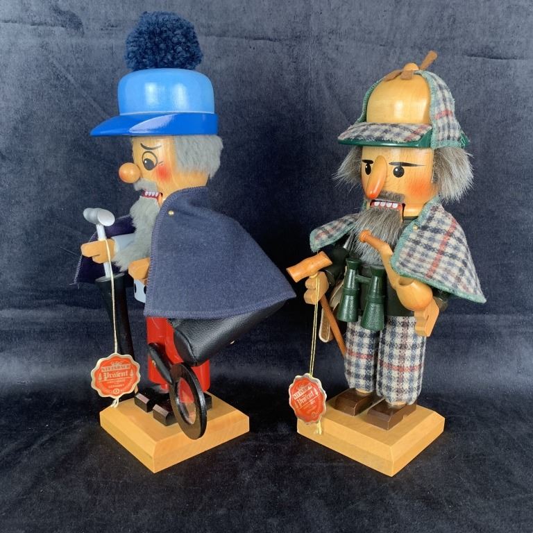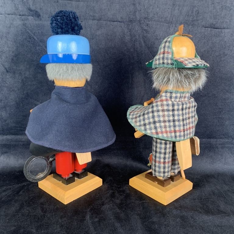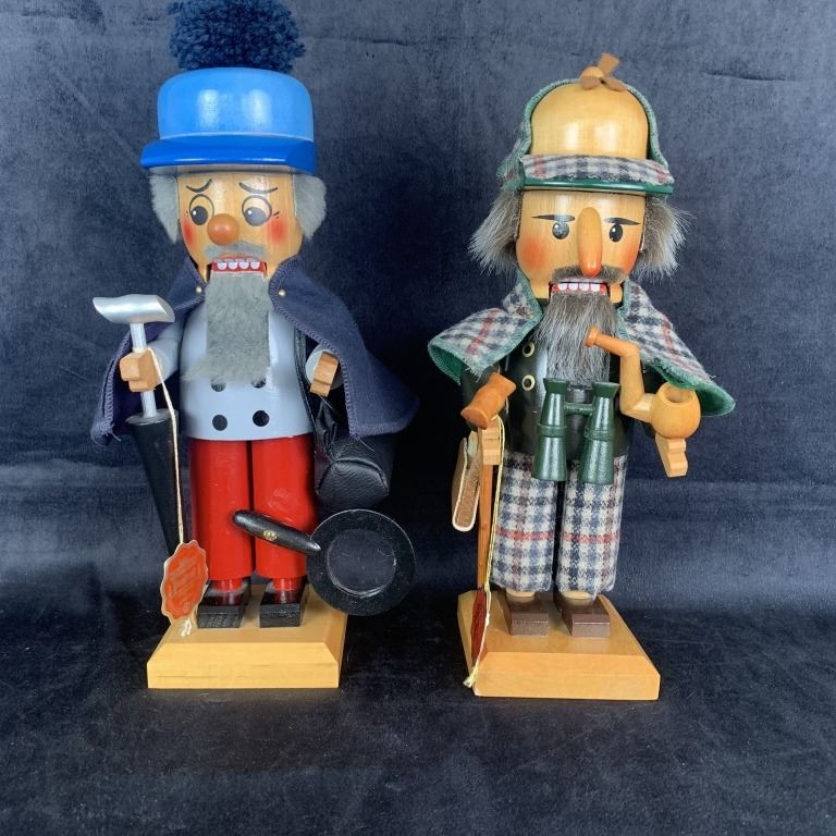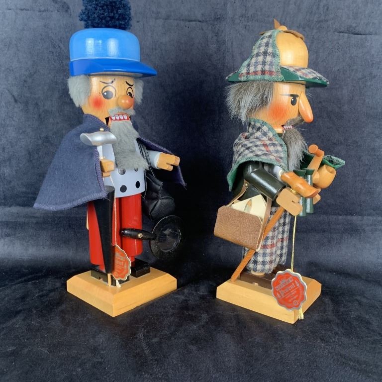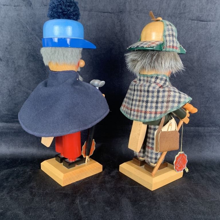 A pair of Steinbach Nutcrackers, "Sherlock Holmes" and "Dr. Watson". Very cute, whimsical pieces, both with their original tags, and both are in pristine condition without any signs of wear or damage.