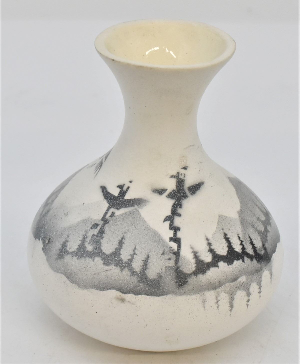 Unusual Stenciled NW Coast Designs on Ceramic Pottery Vase, measures 4.5'' x 5'' and is signed on the bottom, appears to be signed by artist and marked Dine'