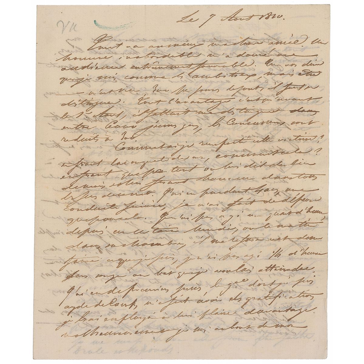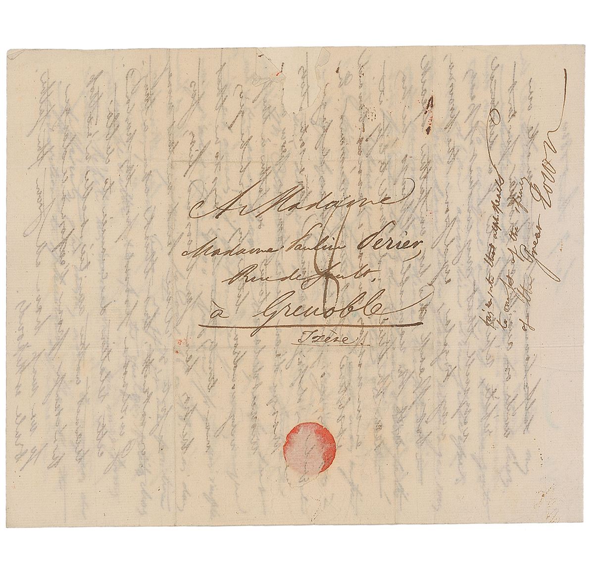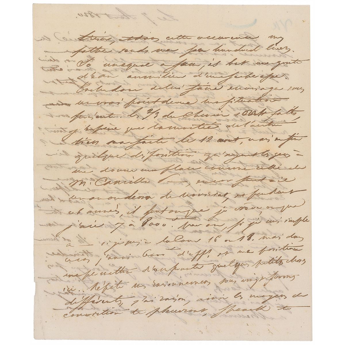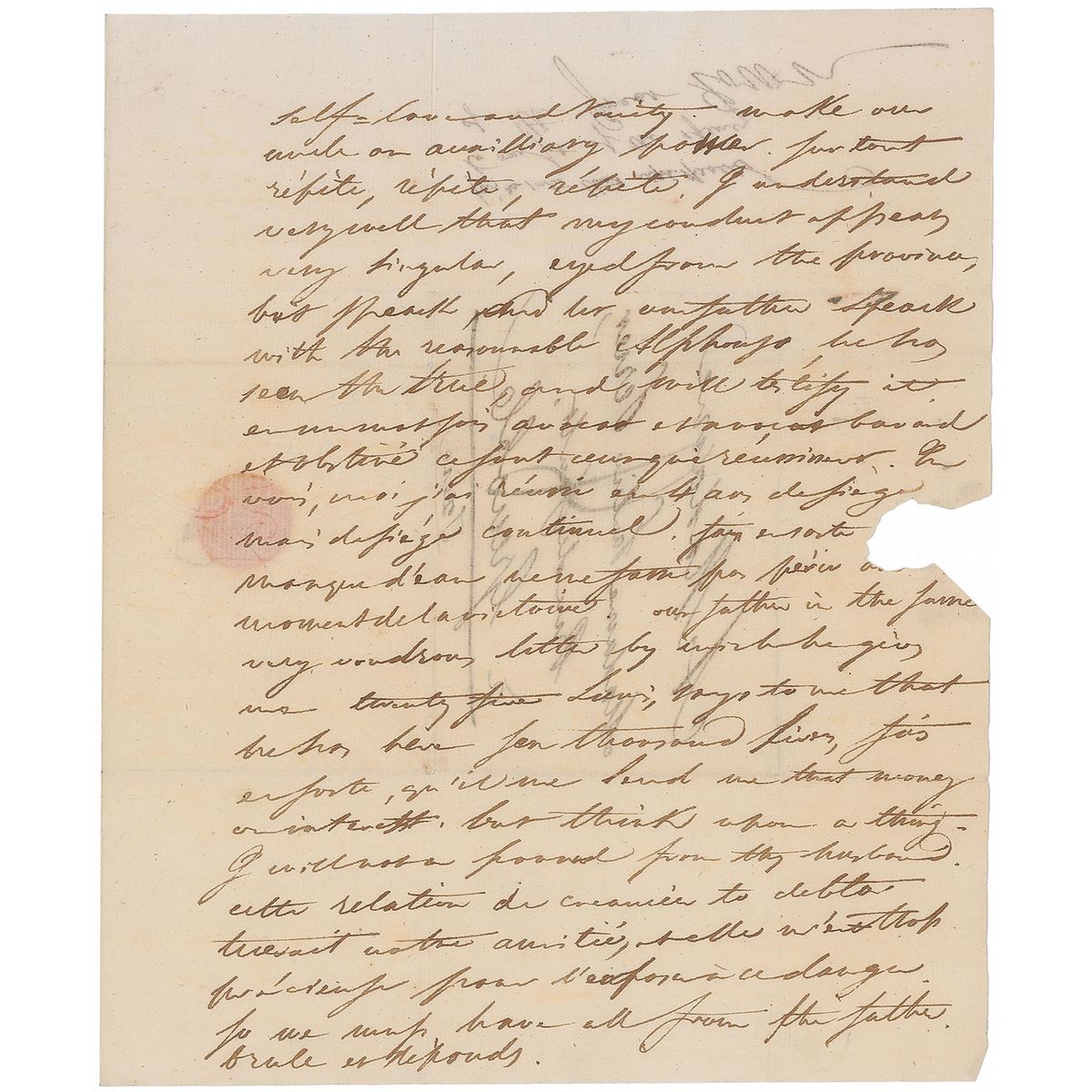 ALS in French, three pages on two adjoining sheets, 7.75 x 9, August 7, 1810. Lengthy untranslated letter to his sister Pauline Perier-Lagrange. Only a few days after being named an auditor with the Conseil d'Etat on August 3, 1810, Stendhal is pleased to report about his initial experience with this new position, saying he has had excellent training. Nevertheless he deplores his own financial situation by mentioning his continuing dependency on fatherly support. In fine condition, with paper loss from seal removal affecting a couple words on the last page and light show-through from writing to opposing sides. A rare and very desirable French literary autograph from the early stages of his career.