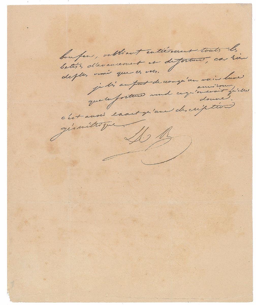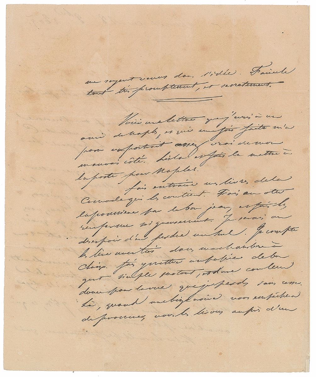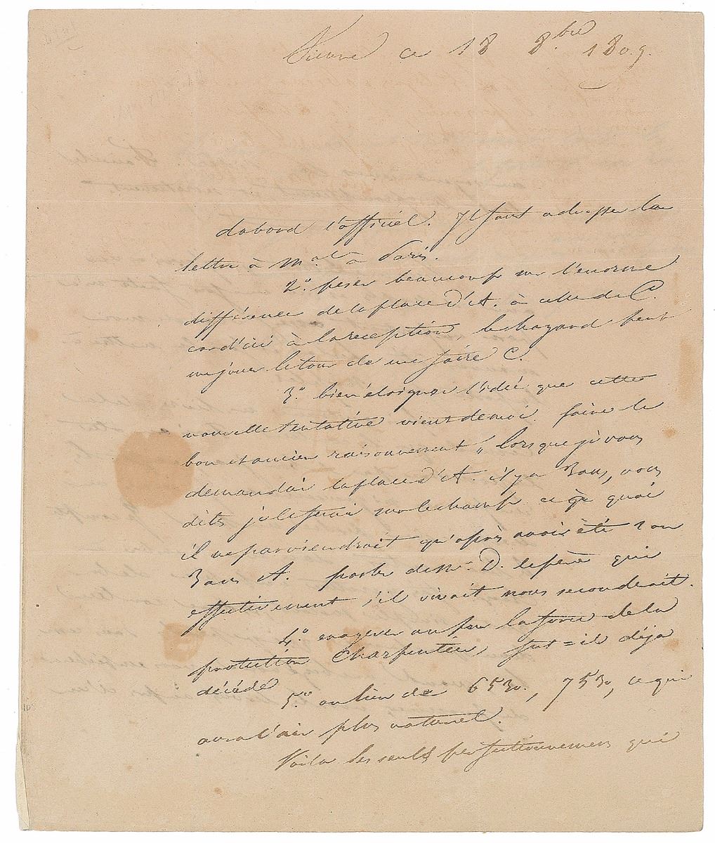 French writer born Marie-Henri Beyle (1783–1842) considered one of the earliest and foremost practitioners of realism. Extremely rare ALS in French, signed “H. B.,” three pages on two adjoining sheets, 7.5 x 9, October 18, 1809. Letter to his sister Pauline, concerning his desired appointment as auditor of the State Council. In part (translated): "First the official. The letter should be sent to Mal [his cousin, Martial Daru] in Paris. 2. Underline the enormous difference between the Auditor job and Commissioner job. Because until the receipt of the letter there is a chance he would play the trick of making me Commissioner. 3. The idea should not be thought coming from me. Do the good and former thinking: 'When I asked you for the Auditor job 3 years ago you said: I will do it straight away but it was not done.' Talk about Noel Daru the father who could help us if he was alive. 4. Do it much about Charpentier’s help even if he’s dead. 5. Instead of 6,530, ask 7,530, which will look more natural. That’s it. See a letter I wrote to a friend of Naples which is a quite true portrait of my bad mood. Send it to Naples. Take off my books from the dresser. Clean them up with the help of the good John. I would be very sad if I lost one. I wish to read them with you in my bedroom at Claix. Wrap them with a nice paper. At a time when a dark wind will not allow us to go for a walk, we will read close to a good fire, forgetting entirely about stupid ambition and fortune. Because nothing is more important that these verses [from Jean de La Fontaine]: 'We read on the foreheads of those who are surrounded by a foolish luxury, that fortune sells what she is thought to give.' It is as accurate as a geometric description." In fine condition, with scattered light foxing, a light circular stain to the first page, and a thin strip of tape along the hinge. Stendhal received the appointment he sought a year later, when he was named auditor of the Conseil d'Etat in August 1810. Although this post of high responsibility raised his social profile, his newfound wealth did not fill his boredom, and he preferred to escape to the arts in his quest for happiness—something he came to call 'Beylisme' in 1811. Stendhal is extremely rare in any form, and this is just the third letter we have ever offered.