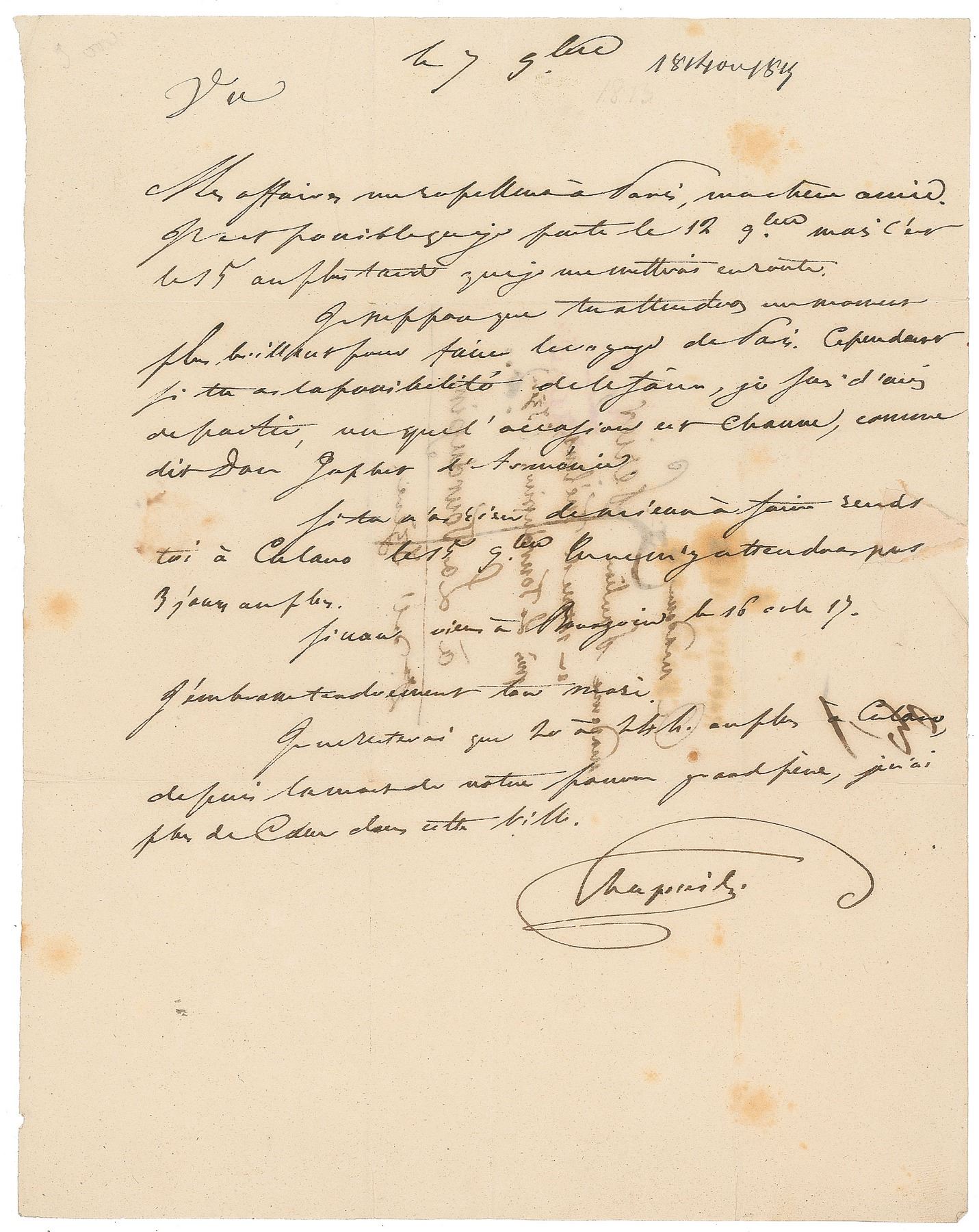 French writer born Marie-Henri Beyle (1783–1842) considered one of the earliest and foremost practitioners of realism. ALS in French, signed with a pseudonym, “Chapuis,” one page, 7.5 x 9.75, November 7, 1813. Letter to his sister Pauline Perier-Lagrange. On the point of leaving Milan, he invites his sister to wait for him on the way to make the trip with him to Paris. In part (translated): "My business recalls me to Paris, my dear friend. It is possible that I leave November 12, but it is the 15th at the latest that I will start. I suppose you will wait for a brighter moment to make the trip to Paris. However, if you have the opportunity to do so, I would leave, as the occasion is bald, as said Japhet don Armenia. If you have nothing better to do, go to Cularo on Nov. 15 You will not expect it: 3 days at most. Otherwise, come to Bourgoin on the 16th or the 17th. I tenderly kiss your husband. I will only stay 20 to 24 hours. at most in Cularo; since the death of our poor grandfather, I have no heart in this city." Addressed on the reverse in Stendhal's hand. In fine condition, with light stains, a small repaired area to the right edge, and show-through from the address panel on the reverse.