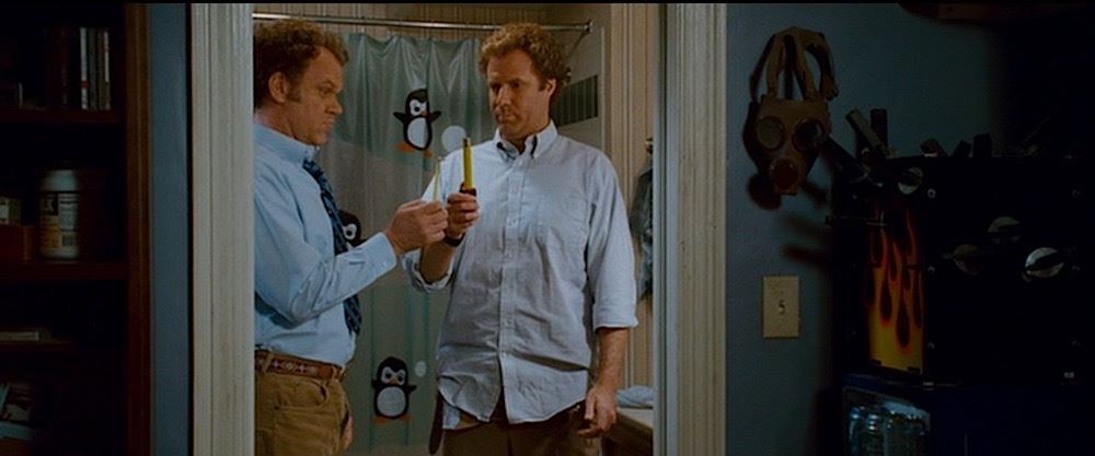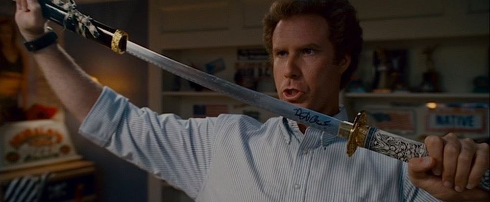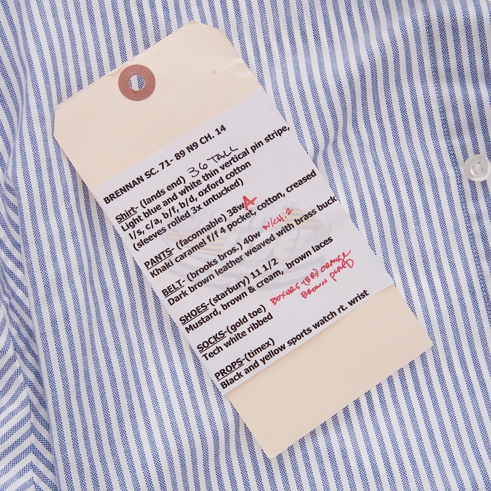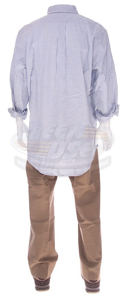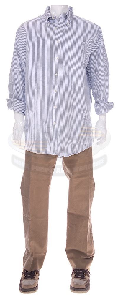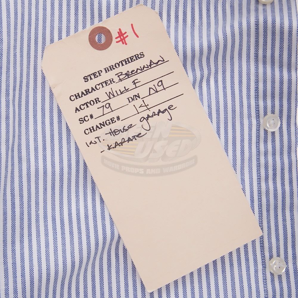 (Columbia Pictures, 2008) This outfit was acquired by the production for use by Will Ferrell as "Brennan Huff". The outfit consists of a light blue and white vertical pin stripe shirt, a pair of Khaki pants and a pair of Starbury sneakers. Included with the outfit is a production used costume tag that details the entire outfit, change and scene numbers used.